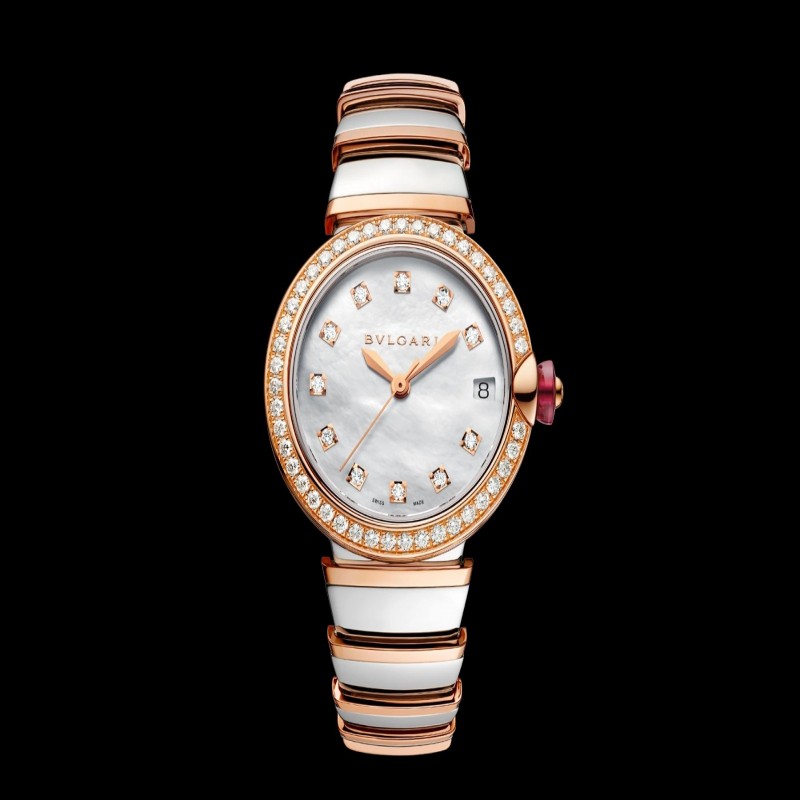 LVCEA 腕錶採用 18kt 玫瑰金不銹鋼錶殼和錶鍊,表圈鑲嵌鑽石,白色珍珠母貝錶盤配鑽石時標。
