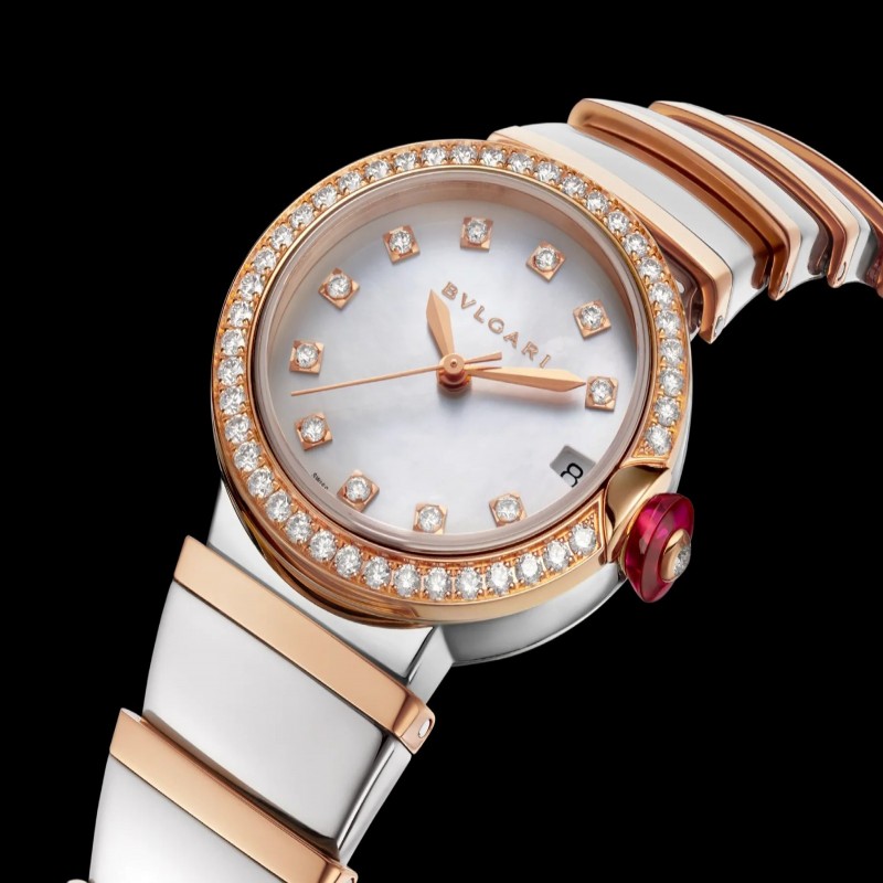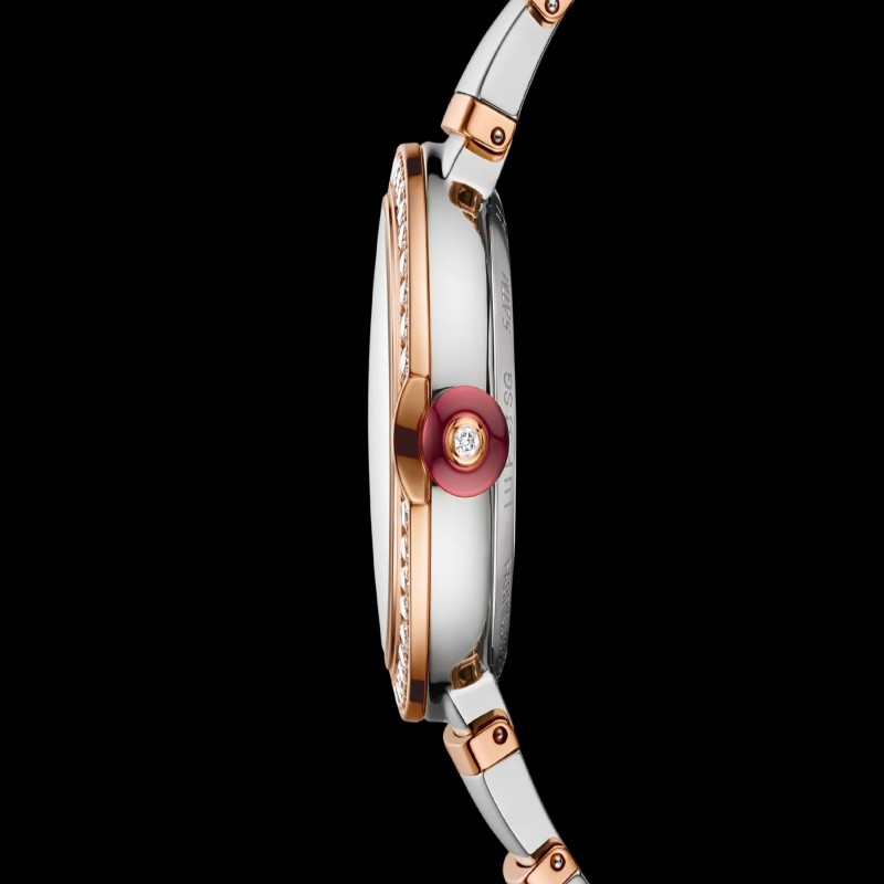 LVCEA 受到光與時間密不可分的聯繫的啟發,向日晷致敬,日晷是根植於古羅馬傳統的最古老的計時儀器之一。LVCEA 捕捉光的力量,或意大利語中的“luce”,以其帶有日晷面的圓形錶殼的光彩閃耀,以現代風為歷史增添風采。每款時計的表冠上都鑲嵌著彩色寶石,是羅馬珠寶商的標誌。LVCEA 手錶,機械製造機芯,自動上鍊,33 毫米不銹鋼錶殼,18 克拉玫瑰金表圈,鑲嵌明亮式切割鑽石,18 克拉玫瑰金表冠鑲嵌一顆人造凸圓形切割紅碧璽和鑽石,白色珍珠母貝錶盤、鑽石時標、不銹鋼和 18 克拉玫瑰金錶鍊。