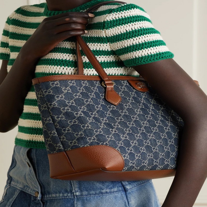 Ophidia 中號紋理皮革邊飾徽標提花牛仔布托特包