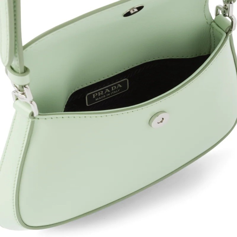 Prada Cleo系列手袋重释品牌标志性的典藏设计,见证古典主义和未来主义的融合。这款弧形迷你单肩包线条简约时尚,底部和侧面别致的倾斜构型赋予包身精美格调。提手配延长带,可手提或斜挎佩戴,颇具实用性。Prada系列常用的特色亮面皮革塑造对比效果。涂珐琅三角形徽标点缀精致廓形,彰显品牌格调。