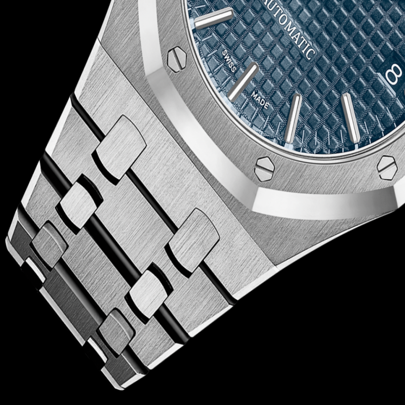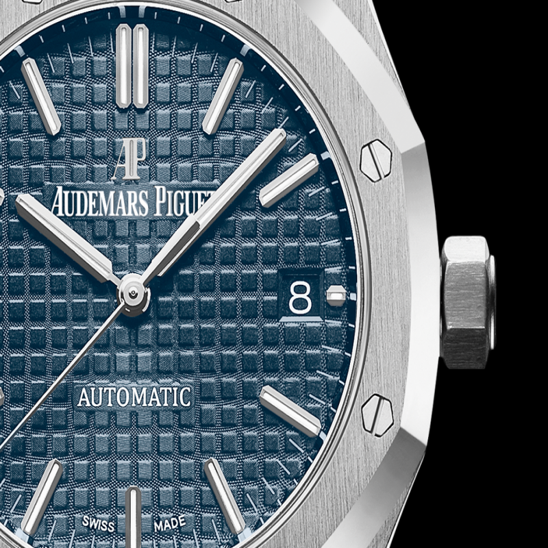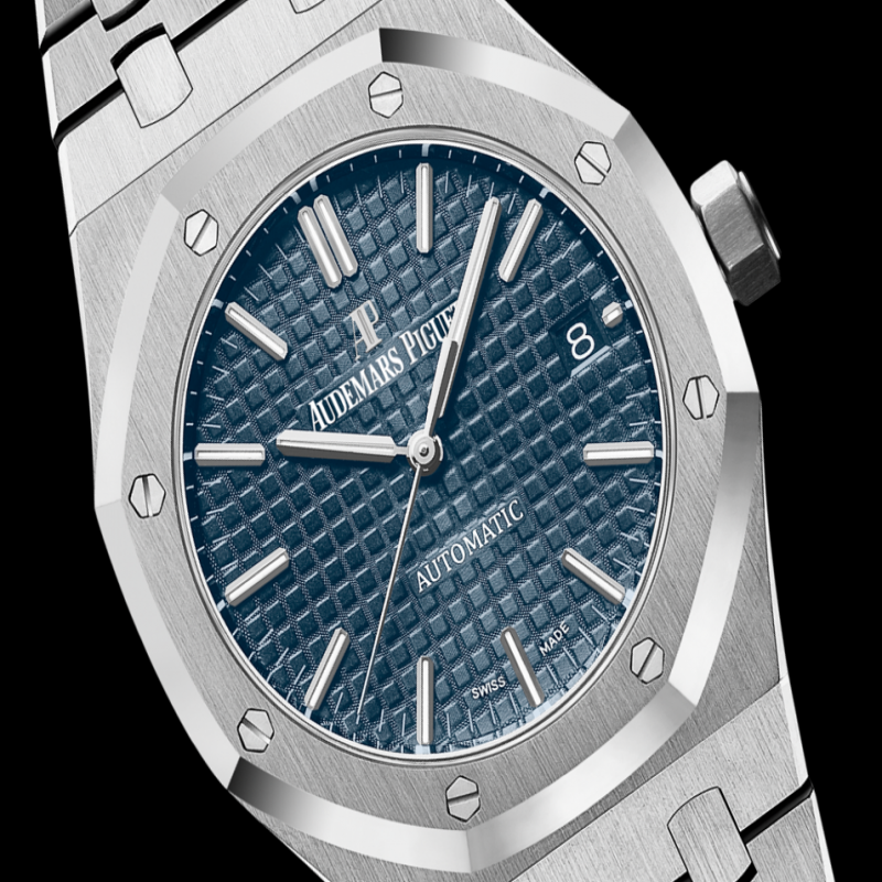 該腕錶延續皇家橡樹系列的創新設計,搭配經過手工精修的精鋼錶殼,以及鈷藍色Grande Tapisserie大型格紋裝飾錶盤。