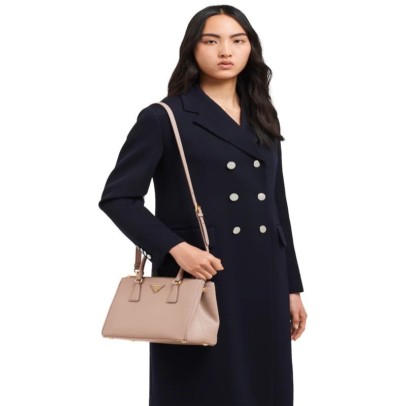 Prada Galleria系列手袋聞名於世可溯至1913年的Prada米蘭伊曼紐爾二世長廊店,表達品牌雋永優雅的格調。這款小號手袋採用Saffiano皮革打造,配有雙提手和可拆卸肩帶,肩背、手提皆可。包身飾以皮革三角形徽標和金色金屬配件,襯托精緻簡約的廓形。