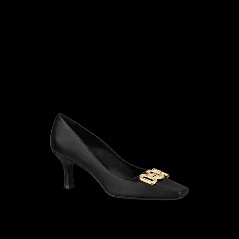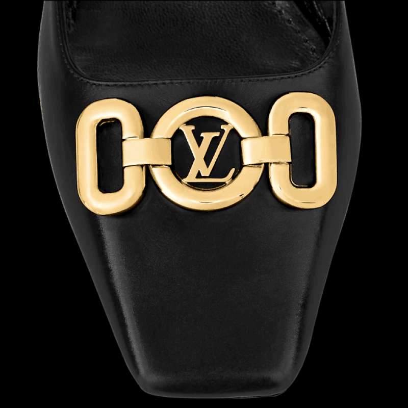 這款Rotary中跟鞋靈感源自1990年代風格,採用方形鞋頭和喇叭形鞋跟設計,重新演繹經典柔美造型。鞋款線條俐落,以柔軟小牛皮搭配粗厚的金色金屬LV Circle標誌配飾,加上襯墊鞋內底,穿著倍感舒適。