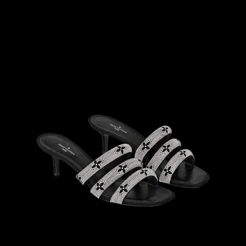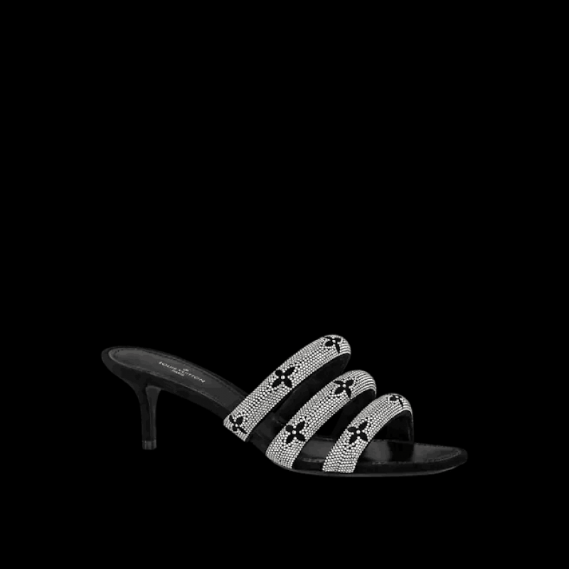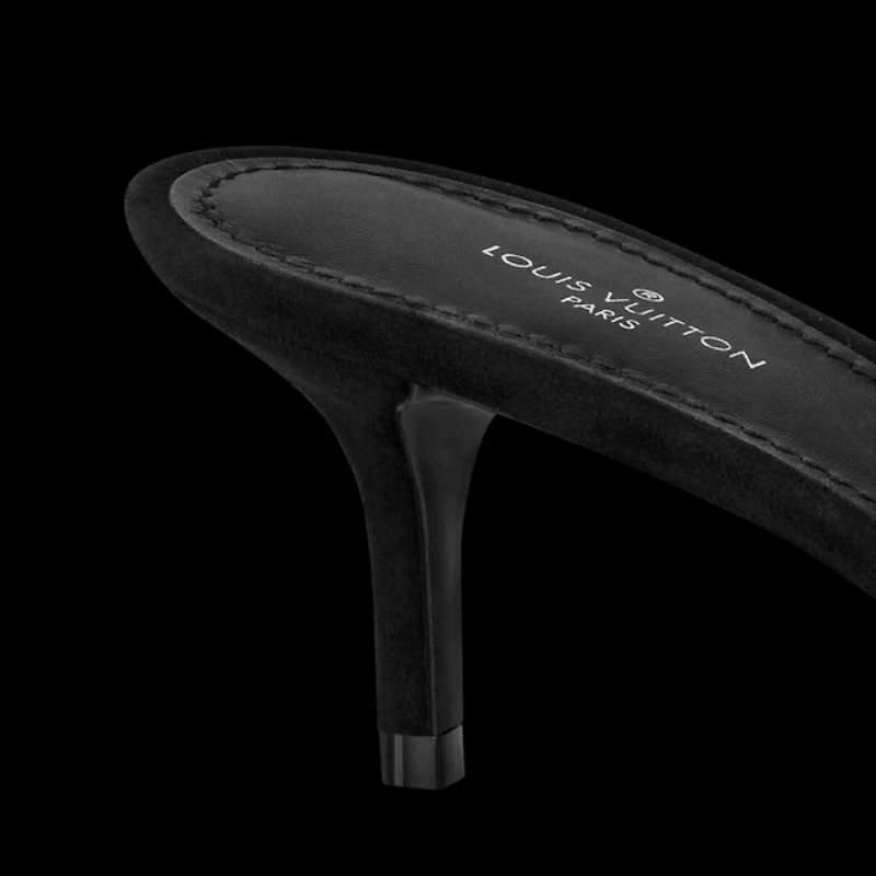 這款精緻的Appeal涼鞋以黑色絨面小山羊皮匠製,綴以閃爍耀眼的水晶萊茵石。三條幼長的鞋帶飾有精緻且具標誌性的Monogram花卉圖案,鞋內底配有襯墊,纖幼的低跟別具柔美的氣質。