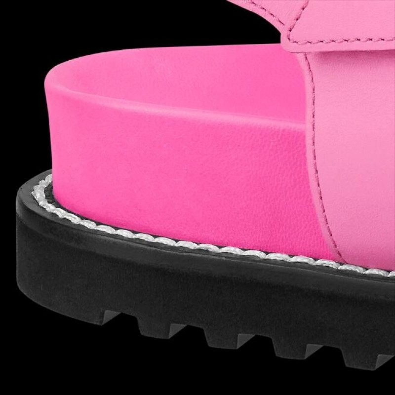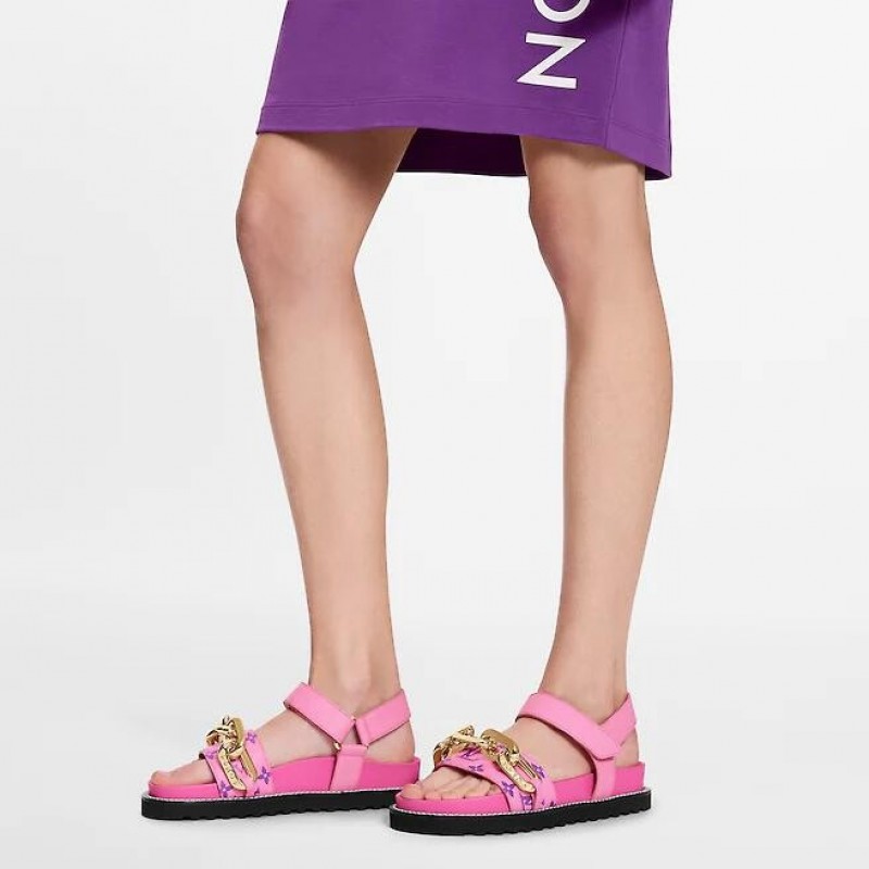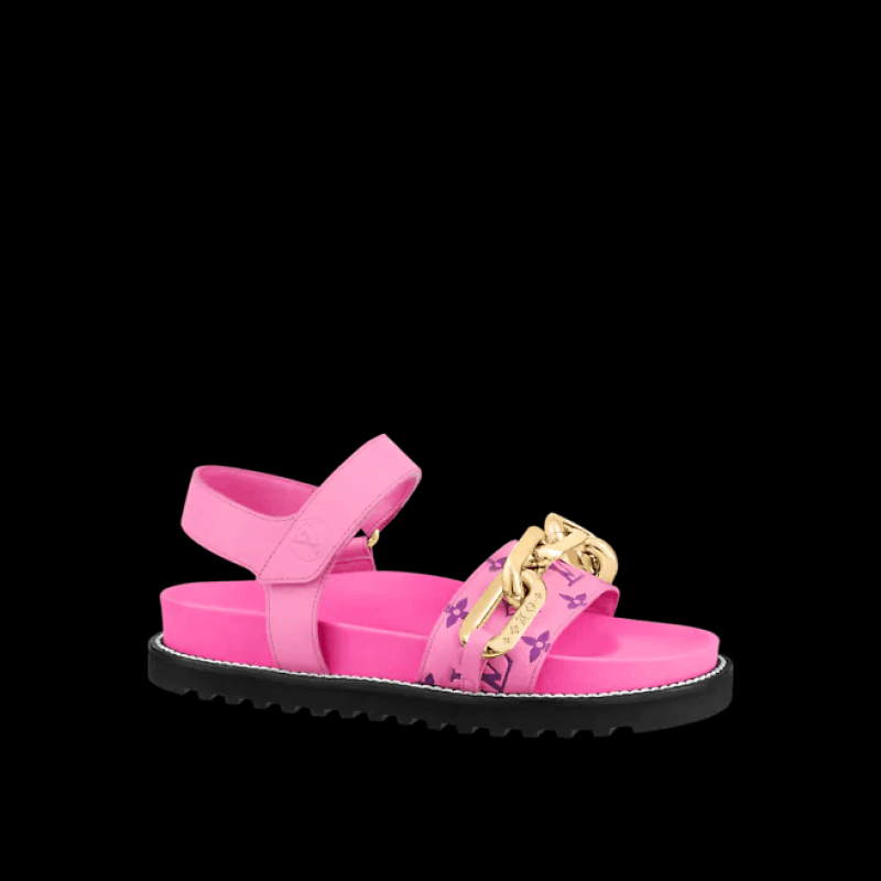 這款色彩繽紛的Paseo平底舒適涼鞋以光滑小牛皮製作,而Monogram壓花小羊皮鞋面搭帶綴以大型金色鏈帶。涼鞋可透過腳踝的實用魔術貼調整鬆緊,而符合腳型鞋墊令穿著時更加舒適。