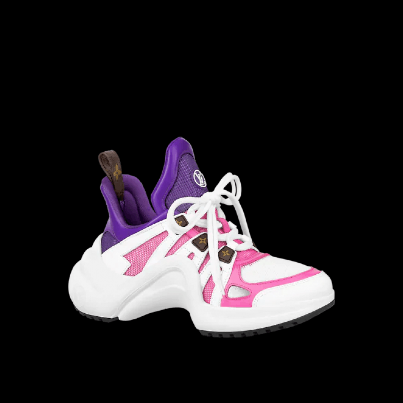 這款LV Archlight運動鞋以白色小牛皮演繹全新造型,綴有多種色調,突顯鞋面的幾何結構。經典設計綴有彈力波浪形鞋底,低調地增添高度,並採用特大鞋舌及柔美的腳踝低筒設計。