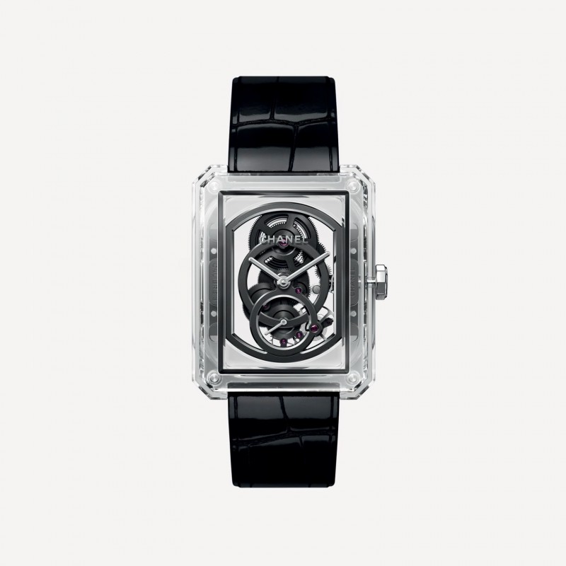 大號款,藍寶石水晶,白18K金鑲鑽,短吻鱷魚皮紋亮面黑色小牛皮錶帶