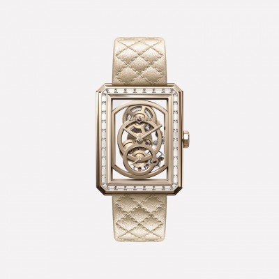 大號款,BEIGE米色18K金鑲鑽,金棕色菱格紋絎縫小牛皮錶帶