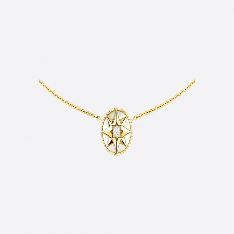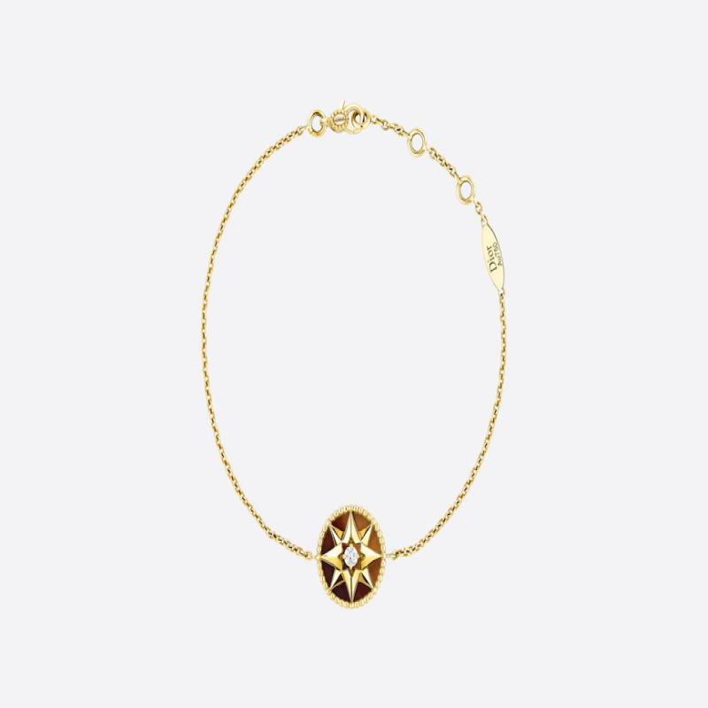 Victoire de Castellane 重新演繹 Dior 先生的幸運星設計,創作出八芒星羅盤玫瑰造型。鏈帶上以稻穗環繞的飾牌可隨意翻轉,交替呈現出寶石和羅盤玫瑰的一面。