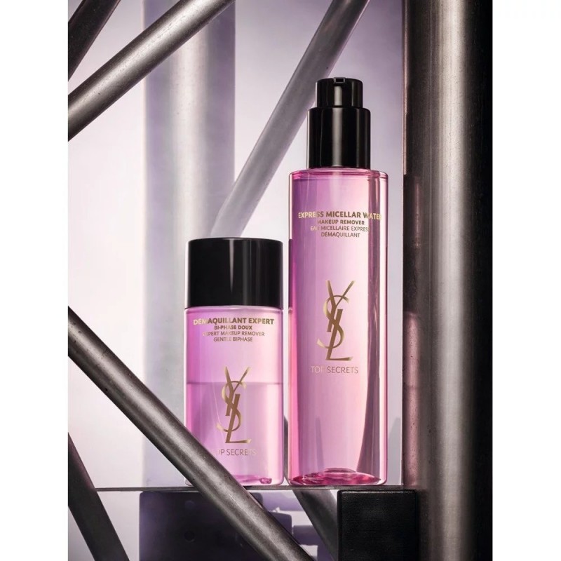 聖羅蘭新亮顏眼部卸妝液具有雙向質地,上層無色油狀質地毫不粘膩,下層藍色水樣質地柔滑肌膚。有效保護並強健睫毛,去除多種類型的化妝品,潔淨及舒緩眼簾及眼睫毛。新版眼唇卸妝液新升級,蘊含五種彩妝親和溶劑,能夠迅速多維度溶解彩妝,同時眼唇部嬌嫩肌膚保持溫和舒爽。敏感眼部肌膚,隱形眼鏡佩戴者適用配方