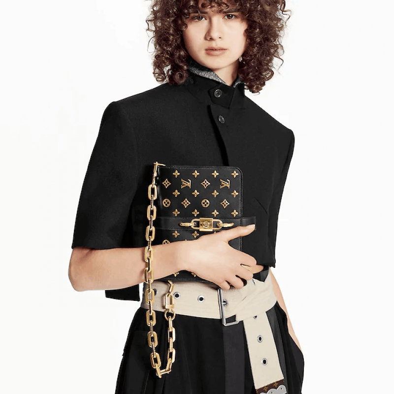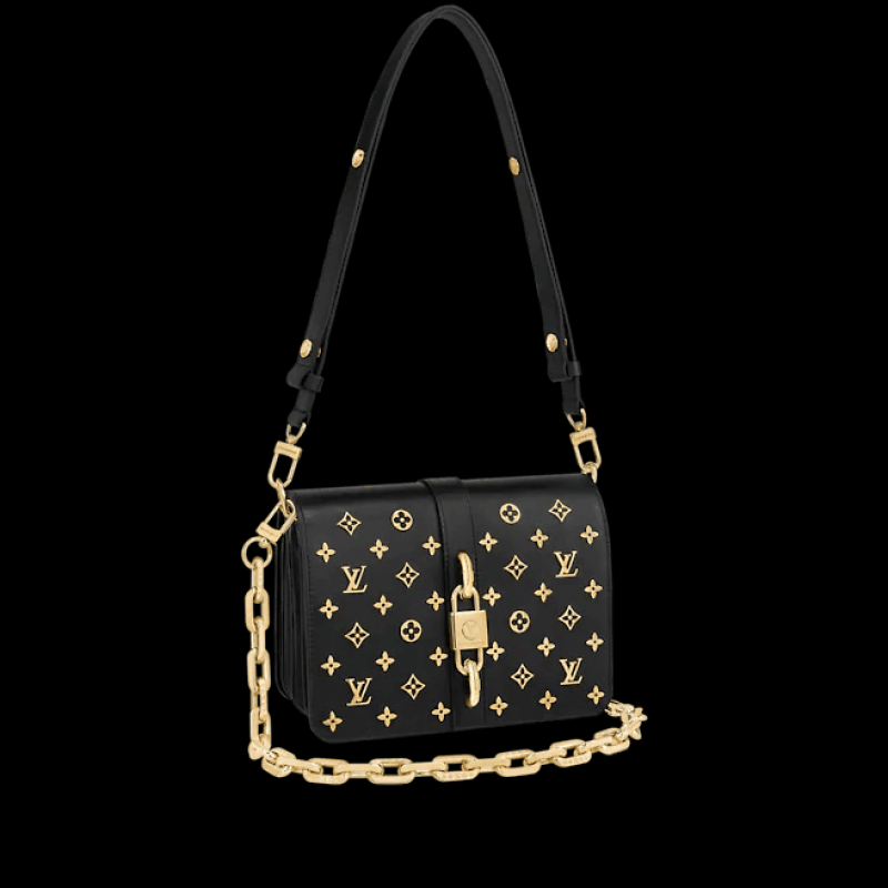 這款Rendez-Vous手袋以黑色小牛皮製造,綴有以金色金屬LV標誌和Monogram花卉圖案組成的Monogram圖案,配備航海風格的粗鏈帶和復古風扣鎖,造型一眼可辨,可作斜背、肩背或作手拿包攜帶。