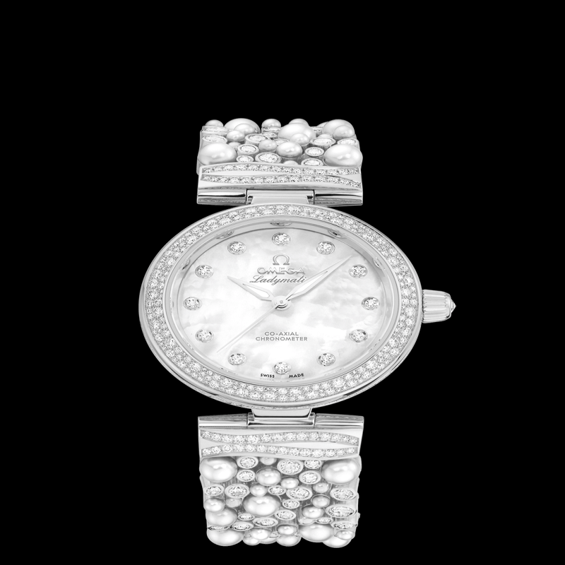錶殼採用白色18K金打造,搭配“雪花鑲嵌”鑽石表圈,拋光旋入式表冠鑲嵌一顆“歐米茄明亮式切割”鑽石。白色珠光珍珠母貝錶盤鑲嵌12枚鑽石時標,搭配拋光白色18K金α形指針。