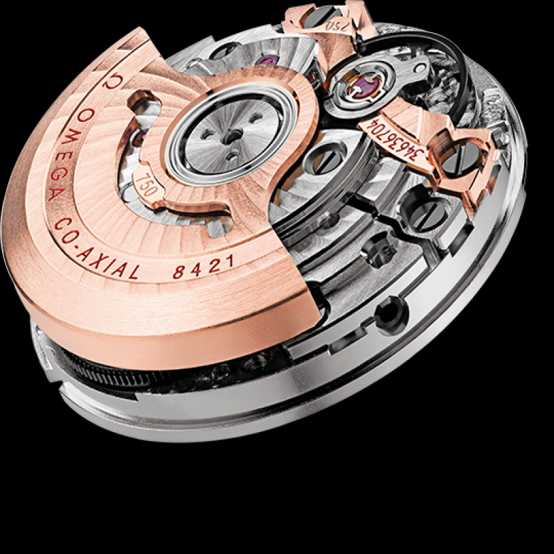 最後,透過透明表背,可飽覽歐米茄8421同軸機芯運轉之美。