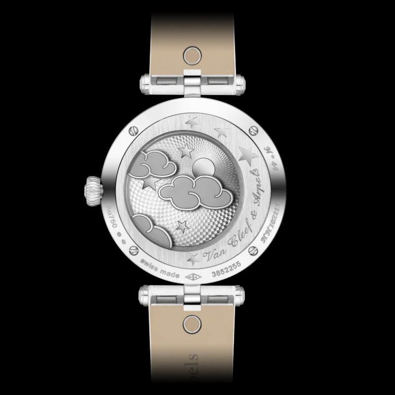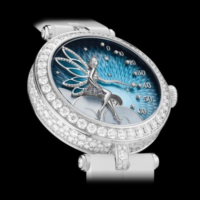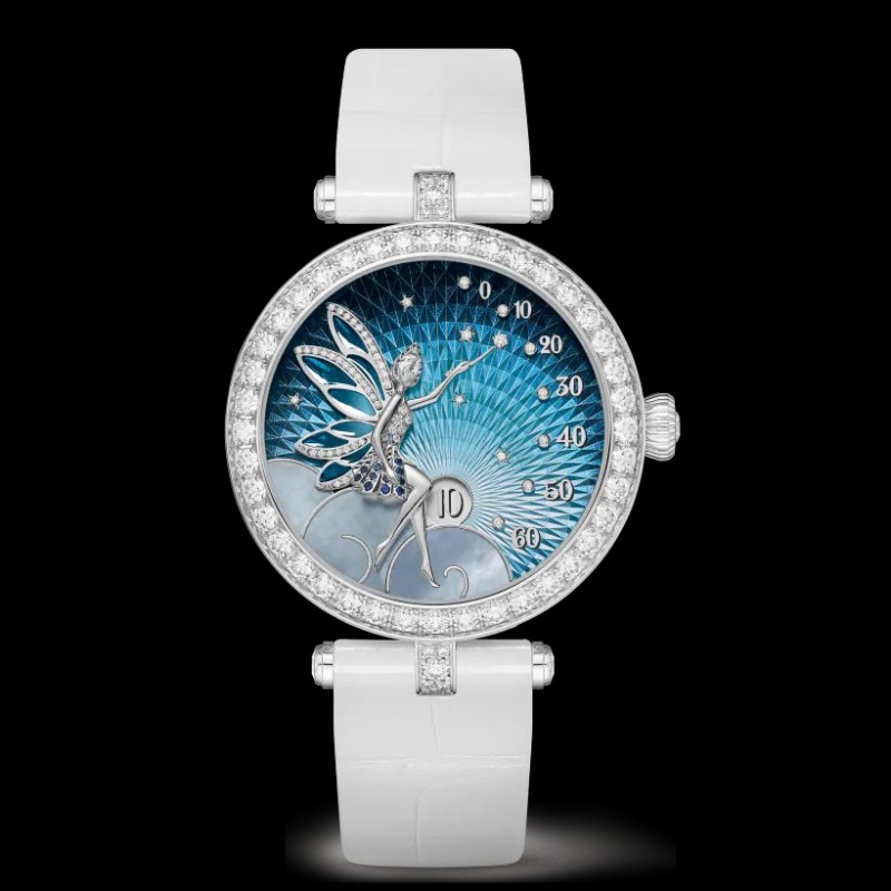 Poetic Complications詩意複雜功能腕錶系列,Lady Féerie腕錶。33毫米白K金錶殼,圓形鑽石;白K金表圈,圓形鑽石;璣鏤雕花珍珠母貝錶盤,圓形鑽石;雕刻白K金仙子,圓形藍寶石,圓形及玫瑰形切割鑽石,細工彩繪;白K金翅膀,Grisaille背光剪影琺瑯搭配彩繪玻璃琺瑯,圓形鑽石;白色珍珠母貝雲朵,白K金;白K金表冠,圓形鑽石;可替換亮面白色鱷魚皮錶帶;可替換白色針式表扣,圓形鑽石; DEF、IF至VVS級鑽石;配備為Van Cleef & Arpels梵克雅寶獨家研發的跳時及逆跳分鐘自動上鍊機械機芯(Valfleurier),36小時動力儲存;附獨立編號。腕錶附兩條可替換錶帶和一個可替換鑲鑽針式表扣。