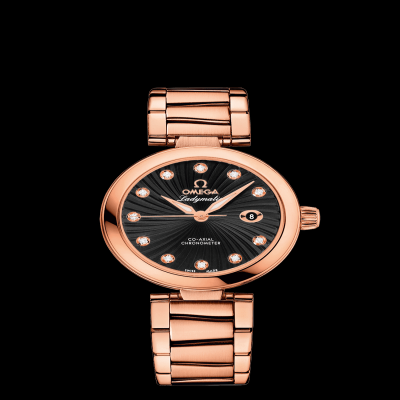 此款歐米茄Ladymatic女錶採用帶有鑽石小時刻度的黑色錶盤,錶盤上飾有太陽射線光芒圖案,3時位置設有日曆窗口。耐磨損藍寶石玻璃錶鏡將華美的錶盤盡展眼前。腕錶採用34毫米18K紅金錶殼搭配18K紅金錶鍊。