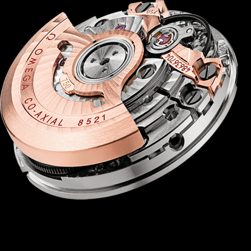 錶殼側緣飾有金質裝飾波紋,黑色陶瓷環位於波紋與內層錶殼主體之間。透過透明表背,歐米茄8521同軸機芯的運轉清晰可見。