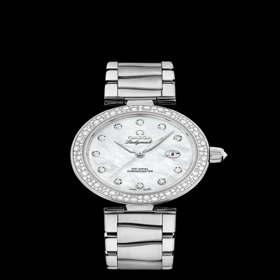 白色珠光珍珠母貝錶盤閃耀無盡光芒,表圈亦鋪鑲“雪花鑲嵌”鑽石,拋光錶冠另鑲嵌一顆“歐米茄明亮式切割”鑽石。