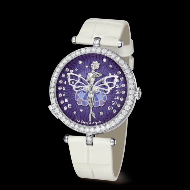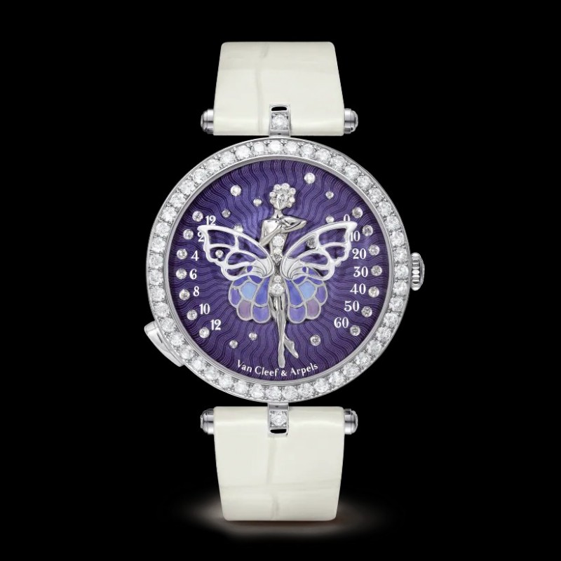 Poetic Complications®詩意複雜功能腕錶系列,Lady Arpels Ballerine Enchantée腕錶。40毫米白K金錶殼;白K金表圈鑲嵌圓形鑽石;紫色琺瑯放射紋錶盤,白K金時標鑲嵌圓形鑽石。雕刻白K金芭蕾舞者鑲嵌圓形及梨形切割鑽石,白K金芭蕾舞裙,內填琺瑯。白K金表冠鑲嵌圓形鑽石。亮面白色鱷魚皮錶帶,白K金針式表扣鑲嵌圓形鑽石。DEF、IF至VVS級鑽石。手動上鍊機械機芯(Valfleurier),搭載為Van Cleef & Arpels梵克雅寶獨家研發的逆跳按掣顯時模塊,59小時動力儲存。附獨立編號