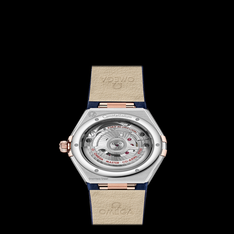 腕錶內部搭載歐米茄8700至臻天文台機芯,透過拱型耐磨損藍寶石玻璃表背,機芯的運轉美態清晰可見。