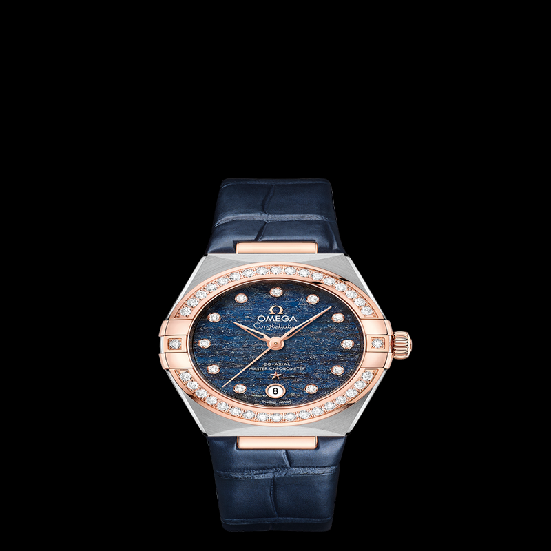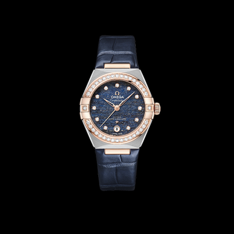 腕錶採用精鋼和Sedna 18K金打造,表圈鋪鑲鑽石,6點位設有日曆窗。指針、小時刻度、歐米茄品牌標識以及星徽標誌以Sedna 18K金製成。