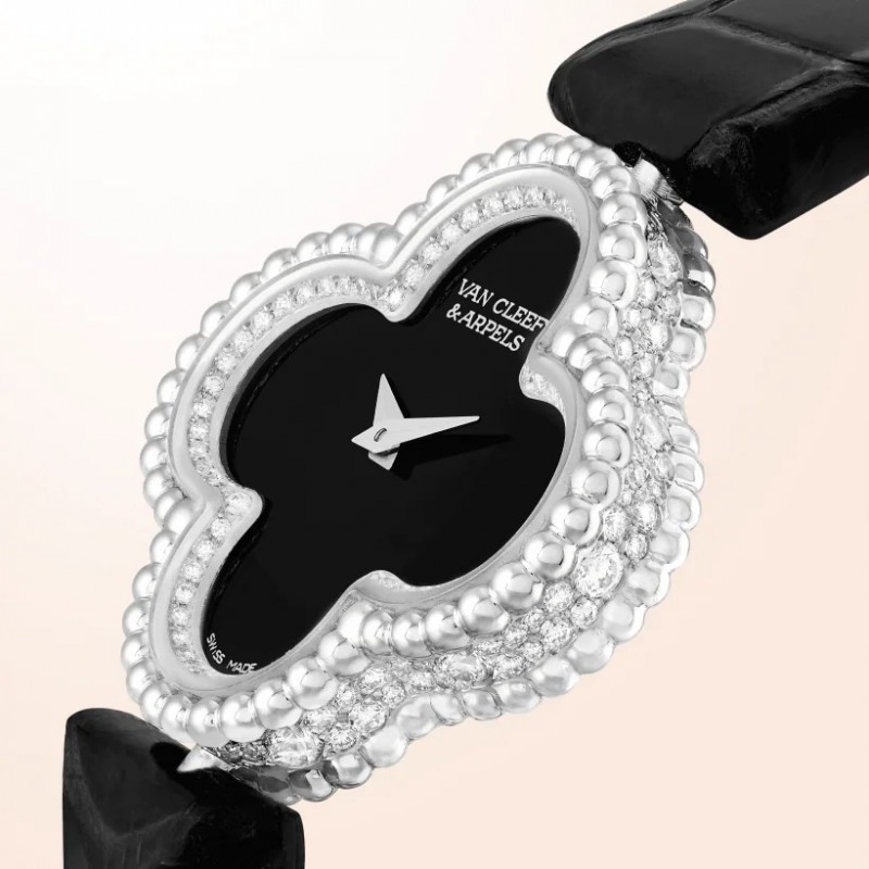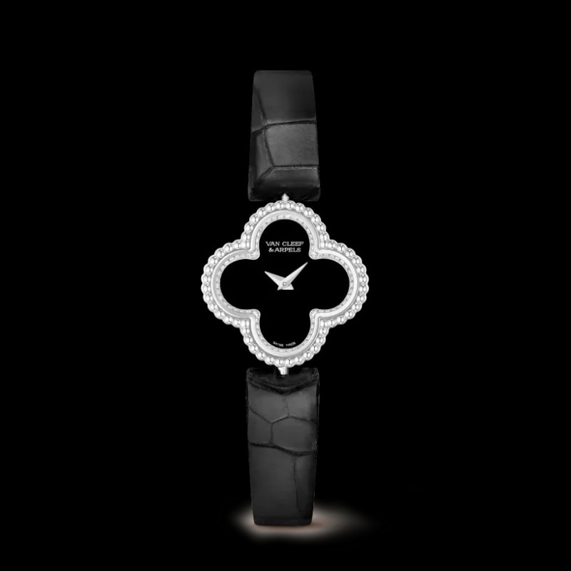 Sweet Alhambra腕錶。22.7毫米x 22.7毫米白K金錶殼,圓形鑽石;白K金表圈;縞瑪瑙錶盤;亮面黑色可替換鱷魚皮錶帶;可替換白K金針式表扣,以雪花鑲嵌法鋪鑲圓形鑽石;DEF、IF至VVS級鑽石;石英機芯