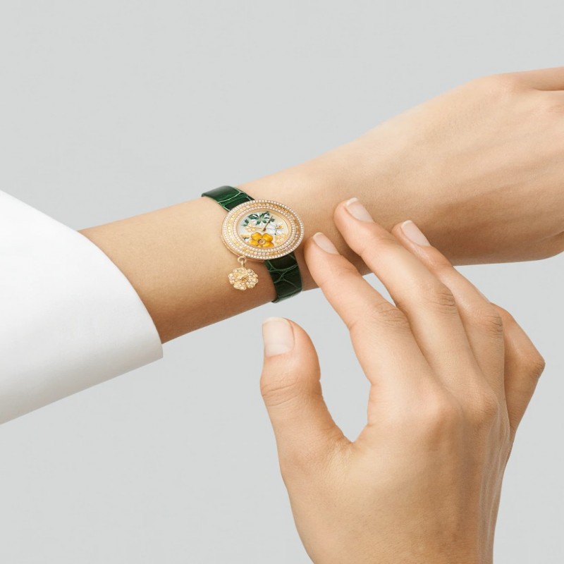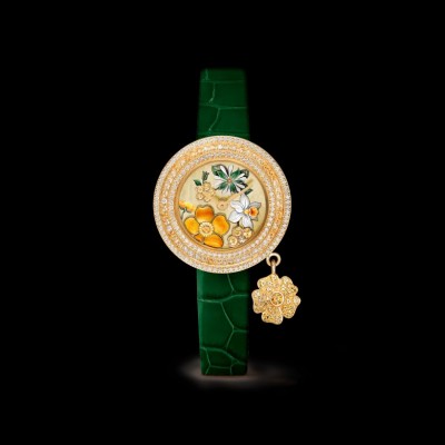 Extraordinary Dials非凡錶盤™腕錶系列,Charms Extraordinaire Espérance腕錶。25毫米黃K金錶殼。黃K金表圈鑲嵌圓形鑽石,黃色藍寶石及錳鋁石榴石。毛茛造型黃K金旋轉吊飾,鑲嵌圓形黃色藍寶石及圓形錳鋁石榴石。錶盤飾有淺色金色珍珠母貝,細工彩繪繁縷,雕刻珍珠母貝飾有細工彩繪黃水仙,背景左邊飾有鑲嵌黃色藍寶石及圓形鑽石的黃K金毛茛,前景則飾有鑲嵌圓形錳鋁石榴石及凸圓形琺瑯的黃K金毛茛。黃K金表冠,圓形鑽石。2條可替換錶帶,亮面綠色鑲嵌圓形鑽石,或白色鱷魚皮配搭黃K金針式表扣。DEF、IF至VVS級鑽石。石英機芯。附獨立編號