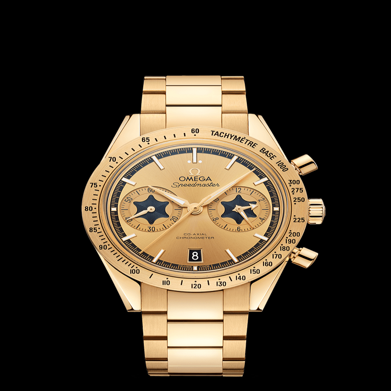 腕錶承襲於1957年問世的歐米茄超霸腕錶原型錶款的設計風格,配備PVD鍍層黃色18K金香檳色太陽紋飾錶盤,錶盤外圍呈黑色,並飾以黃金色轉印分鐘圈。6點鐘位置設有日曆窗。