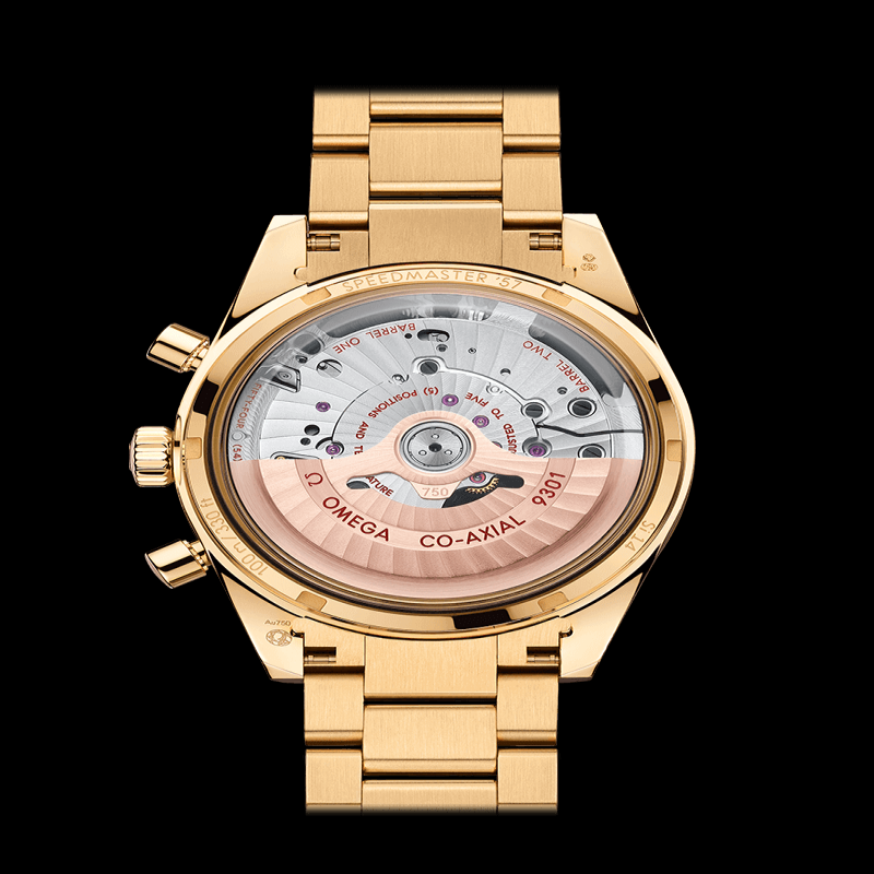 小錶盤的設計別賦新意,9點鐘位置設有小秒盤,3點鐘位置設有12小時和60分鐘計時盤。在紫外線燈的照射下,小錶盤亦會顯現出數字16和61。41.5毫米錶殼採用黃色18K金材質,表圈經過拉絲處理,並飾有測速刻度。這款計時腕錶搭配同材質錶鍊,內部搭載歐米茄9301同軸機芯。