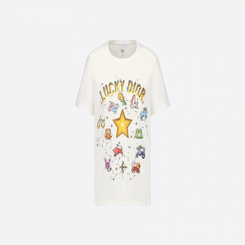 這款米白色棉及亞麻平織布 T 恤綴以 Dior Pixel Zodiac 主題圖案,透過奇幻而繽紛的設計,為星座帶來全新演繹。此款經典圓領剪裁作品的正面綴以「LUCKY DIOR」字母,背面則綴以蜜蜂圖案及「CD」標誌。這款 T 恤可配搭任何造型,四季皆宜。