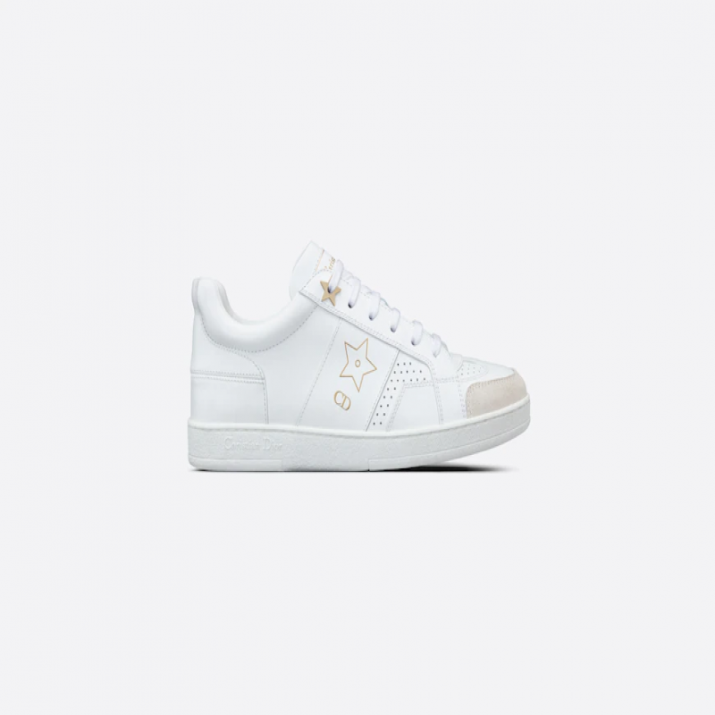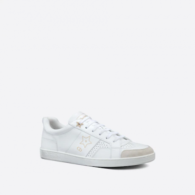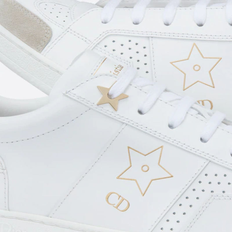 這款 Dior Star 運動鞋是最新的必備單品,設計採用雋永經典的線條。以白色小牛皮製成,正面綴以同色系麂皮鑲片。此款式綴以金色色調「CD」和「Christian Dior PARIS」標誌,其中一個鞋帶孔眼飾有金色飾面金屬星星。此款輕盈的運動鞋採用標誌薄鞋底設計,一年四季都能為任何休閒造型添加點綴。