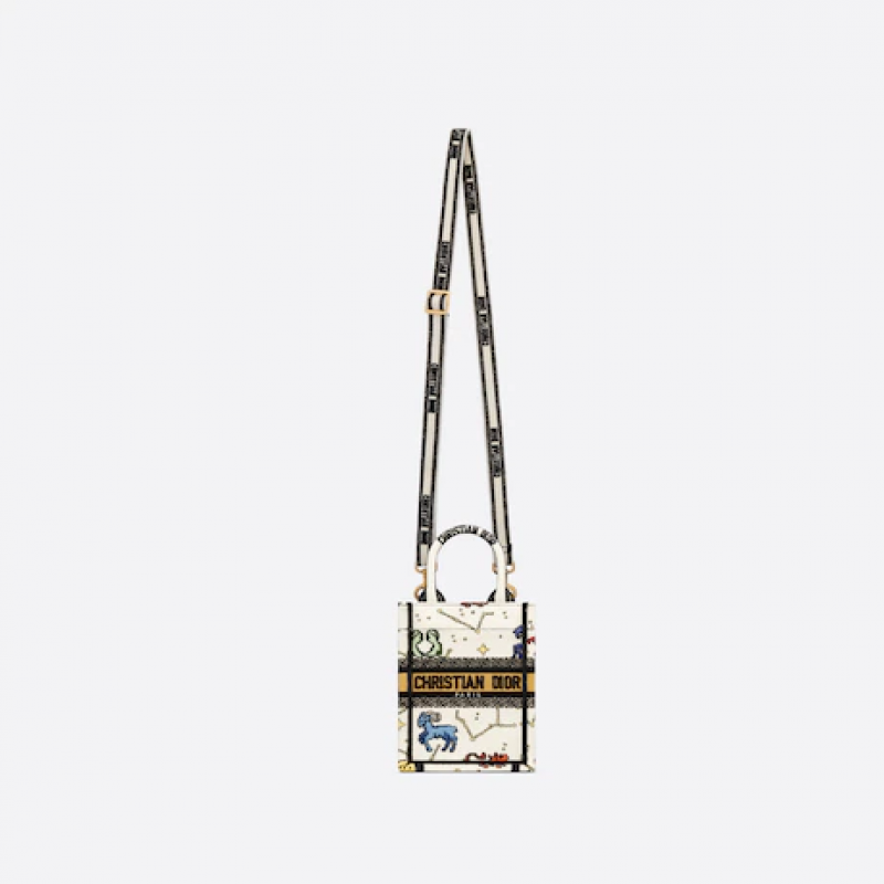 Maria Grazia Chiuri 設計的手機袋為經典的 Dior Book Tote 系列增添新款式,是品牌精湛工藝的典範。此奶白色款式綴以全幅多色 Dior Pixel Zodiac 主題圖案刺繡,以奇幻繽紛的方式為星座符號帶來全新演繹。此迷你手機袋正面綴以「CHRISTIAN DIOR PARIS」標誌,可容納 1 部手機及細小的日常必需品。此時尚配飾配以可調節和可拆卸的刺繡肩帶,可手提、肩背或斜背。