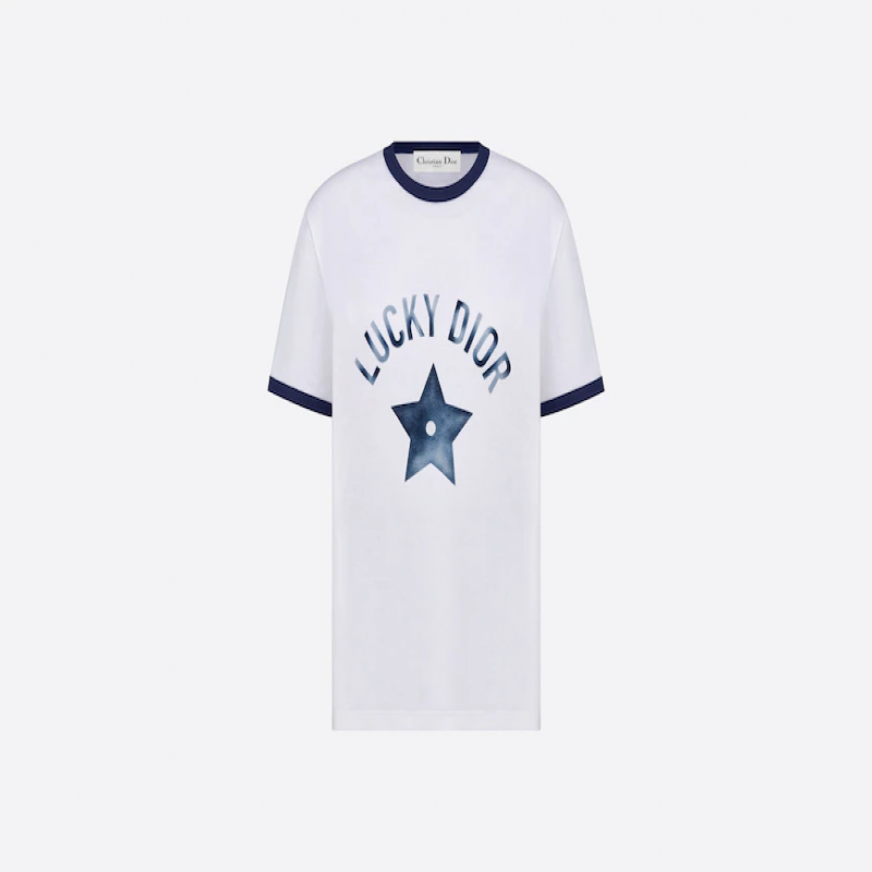 這款 T 恤飾有「LUCKY DIOR」字母及品牌的幸運星。以白色棉及亞麻平織布製成,設有對比色圓領及袖口,呈現休閒造型。這款 T 恤可輕鬆配搭任何造型,四季皆宜。