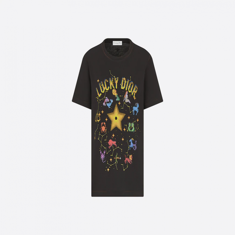 這款黑色棉及亞麻平織布 T 恤綴以 Dior Pixel Zodiac 主題圖案,透過奇幻而繽紛的設計,為星座帶來全新演繹。此款經典圓領剪裁作品的正面綴以「LUCKY DIOR」字母,背面則綴以蜜蜂圖案及「CD」標誌。這款 T 恤可配搭任何造型,四季皆宜。