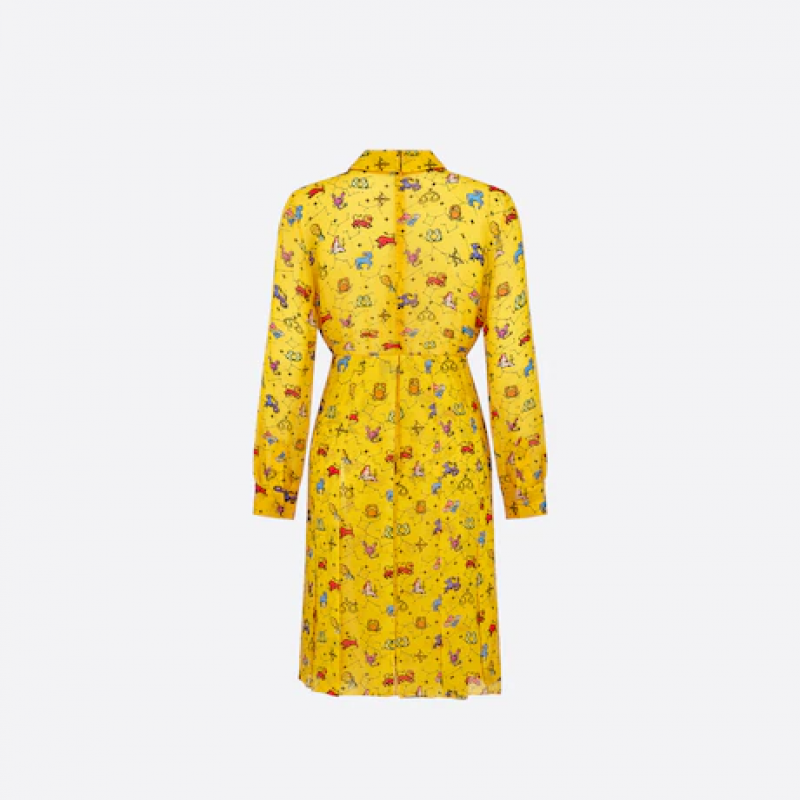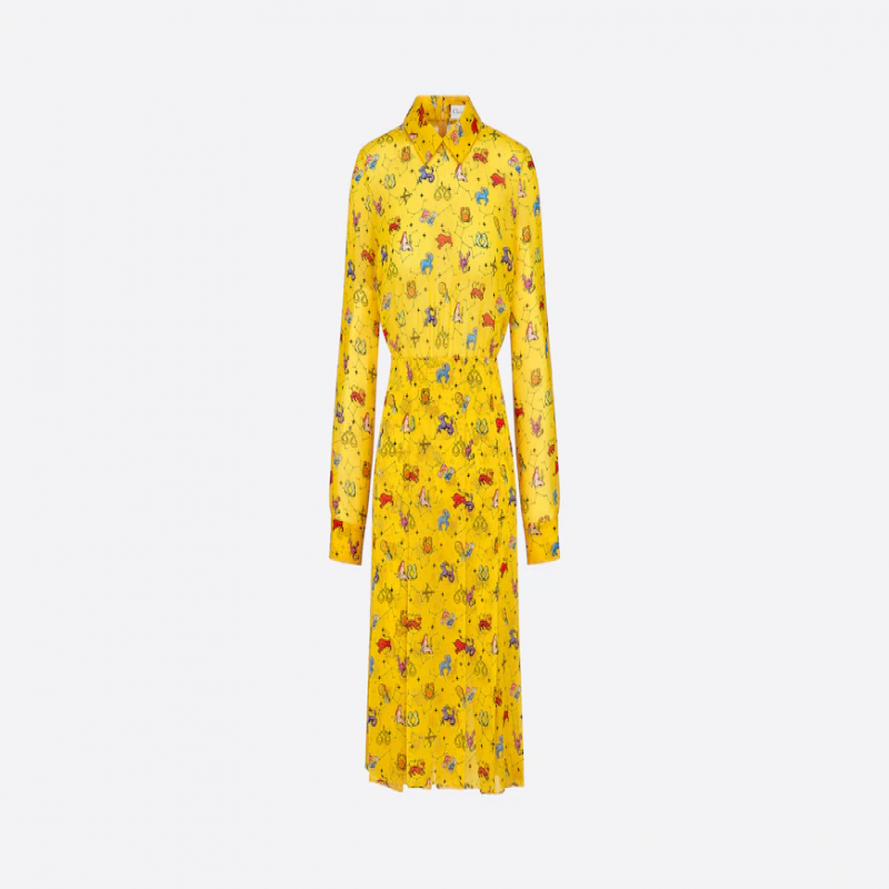 中長恤衫連身裙 黃色真絲薄紗綴以多色 Dior Pixel Zodiac 主題圖案 編號: 241R42A6553_X2829