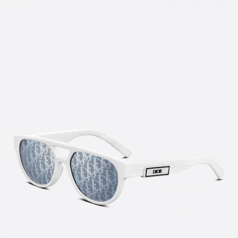 這款 Pantos 造型的 DiorB23 R1I 太陽眼鏡以同名運動鞋為靈感,體現休閒的都市美學風格。白色醋酸纖維雙橋鏡托鏡框綴以白色和黑色橡膠「DIOR」鑲片。鏡臂內側綴以 Dior Oblique 主題圖案,配以銀色鏡面效果的藍色鏡片,打造休閒風格。這款顏色在 Dior.com 及 Dior 精品店獨家發售