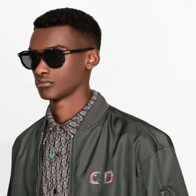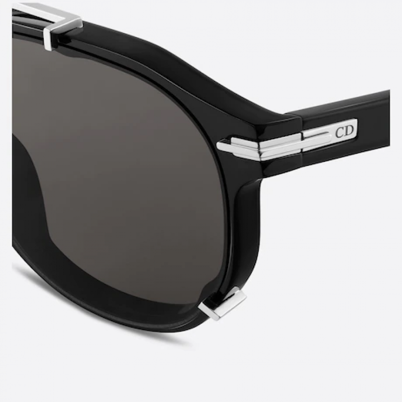DiorBlackSuit RI 太陽眼鏡以 pantos 造型的休閒典雅風格為特色。經典鉸鏈綴以巧妙的鐫刻「CD」標誌,並帶有象徵 Dior 男士西裝縫線的細節。此款式採用雙橋鏡托設計,配以灰色鏡片外圍的銀色色調金屬細節,為黑色醋酸纖維鏡框增添現代感。