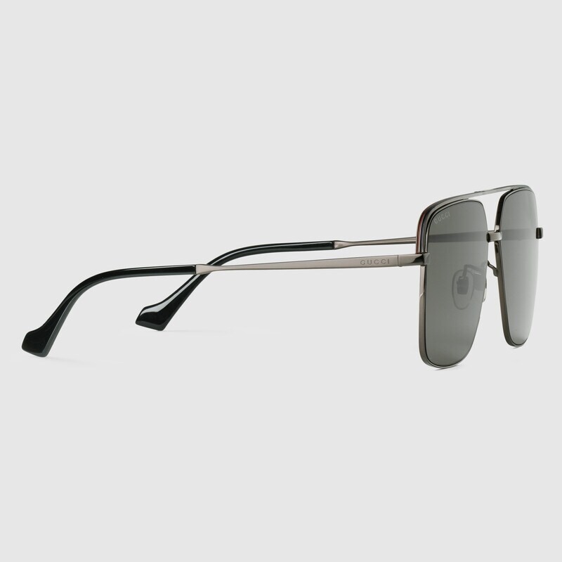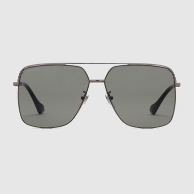 這款釕色調灰色金屬材質的長方形鏡框造型纖細,同時在鼻樑架上方融入別緻的橫條細節。黑色醋纖鏡腳增添對比效果,而鏡腿上的Gucci字母則為單品注入品牌標識魅力。