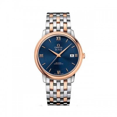 歐米茄碟飛典雅系列以其經典優雅的設計,一直深受愛戴者的鍾愛。此表款的藍色深淺同色表面經太陽線紋打磨,3、6、9及12時位置飾有羅馬數字刻度。表面的3時位置設有日曆窗,並覆蓋防磨損藍寶石水晶鏡面。直徑36.8毫米,不銹鋼表殼配置18K紅金表圈,襯以紅金鋼「雙色」表鏈帶。這款時計內置同軸機芯2500。
