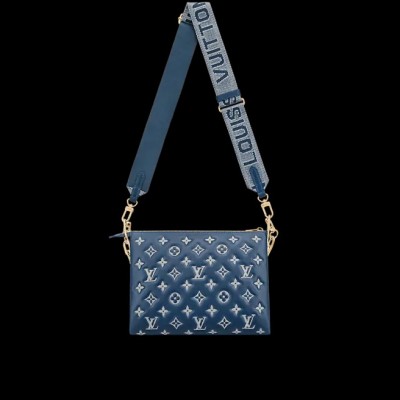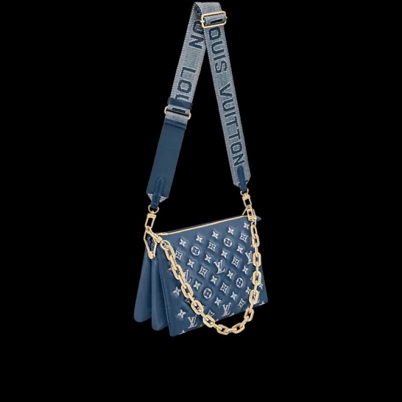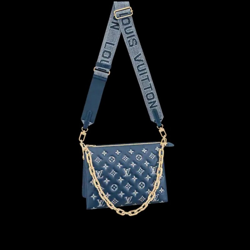 本款Coussin 小號手袋擷取2021 春夏系列的矚目格調,以丹寧效果印花羊皮革展現新意。寬幅織物肩帶和粗獷長鏈條均可隨心拆卸,方便肩背或斜挎。