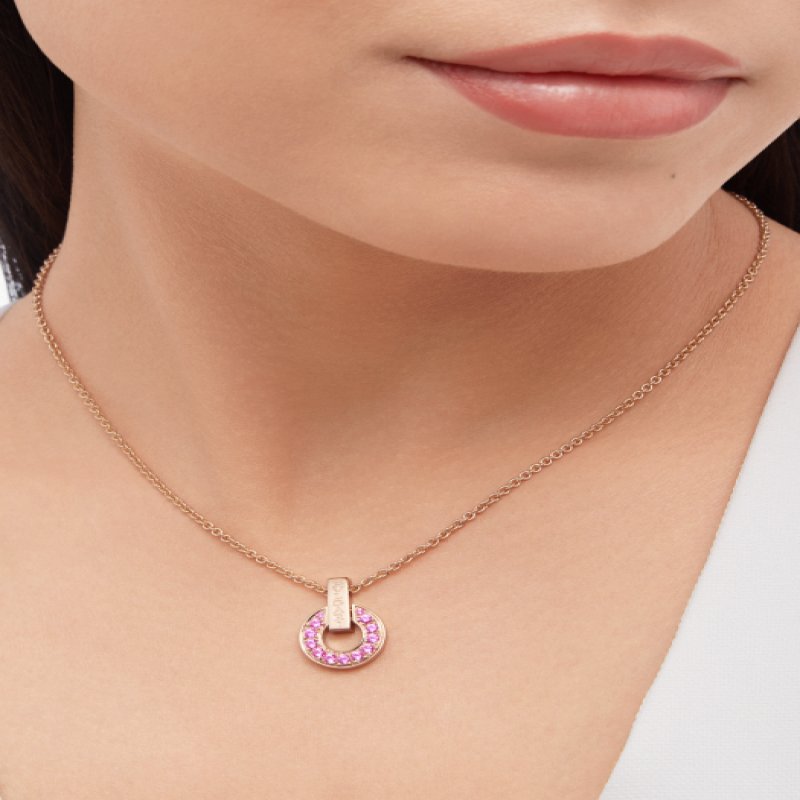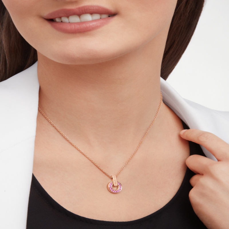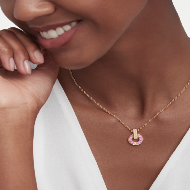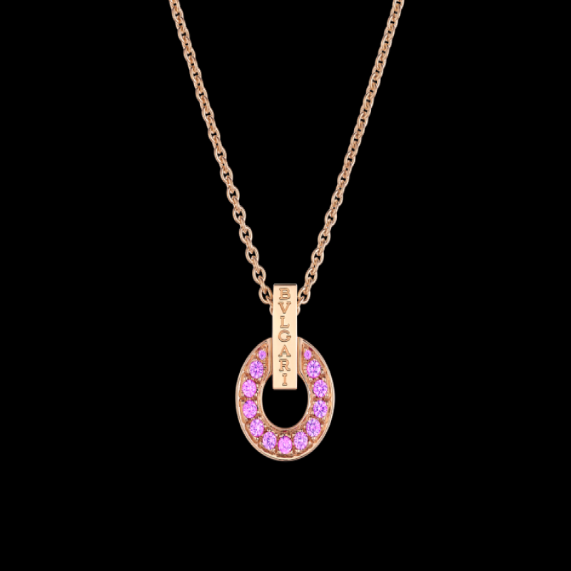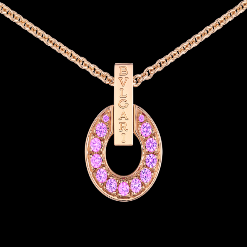 BULGARI BULGARI系列18K玫瑰金吊墜項鍊以品牌奉為靈感來源的羅馬文化為根基,呈現傳統與現代的優雅融合。系列經典的圓形圖案令人聯想起古羅馬錢幣上的弧形銘文,在此件作品中以別緻的鏤空設計重新詮釋,鑲嵌粉色藍寶石,巧妙融合雋永美學與精緻寶石。大中華區專售特別版。BULGARI BULGARI系列鏤空吊墜項鍊,18K玫瑰金材質,鑲嵌粉色藍寶石。