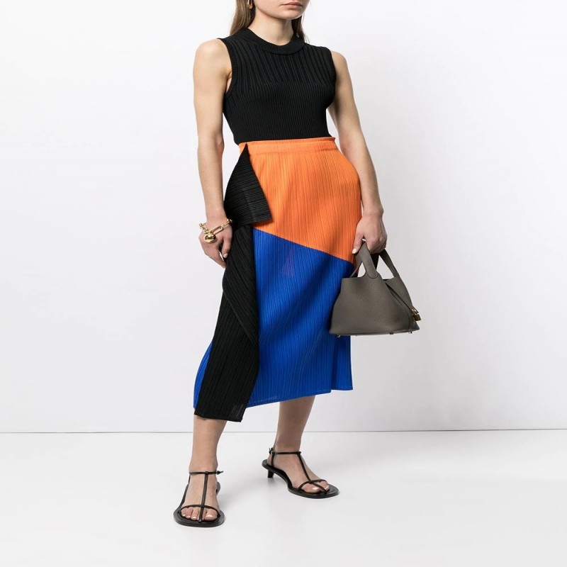 模特身穿:Jil Sander Copper Brown Jil Sander皮質髮束,Pleats Please Issey Miyake Collage細褶效果直筒半身裙,Jil Sander鍍金圈形耳環,Jil Sander T字袢帶涼鞋。