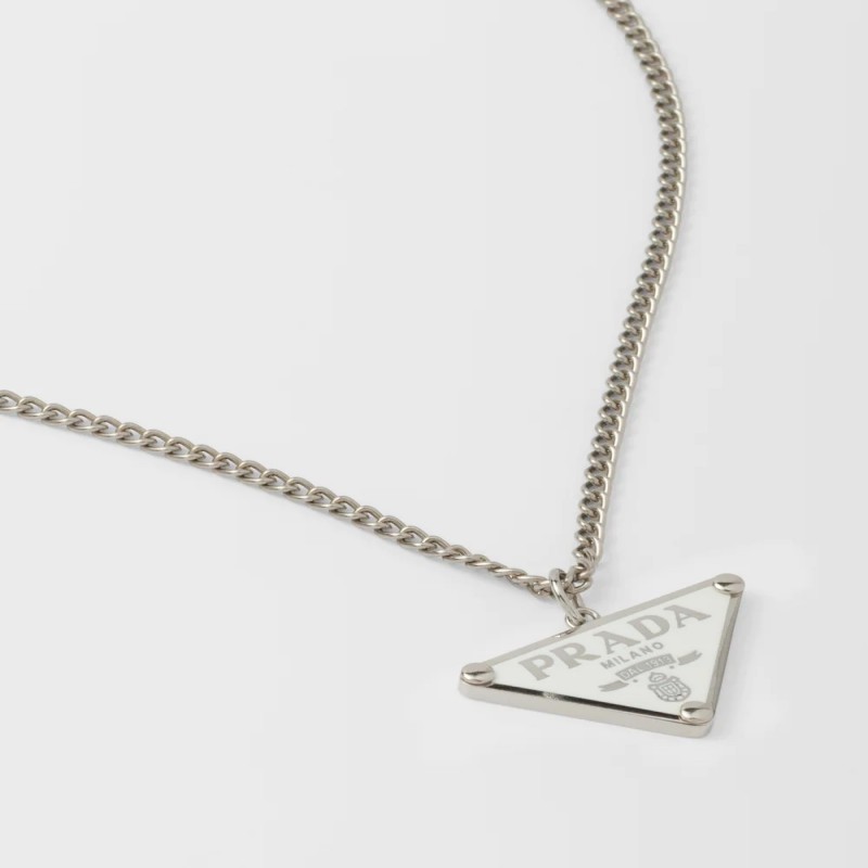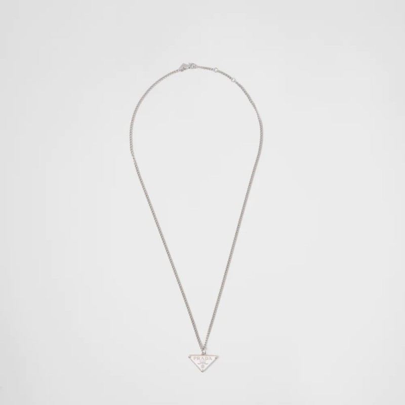 這款鈀金飾面鍊式項鍊的吊墜飾以頗具歷史底蘊的Prada琺瑯標識,瀰漫雋永氣息。全新925銀珠寶系列以簡約而標誌性的三角形徽標為主角,用現代方式重釋朋克元素。