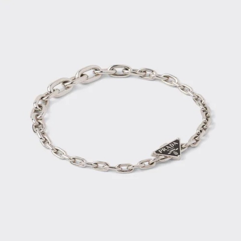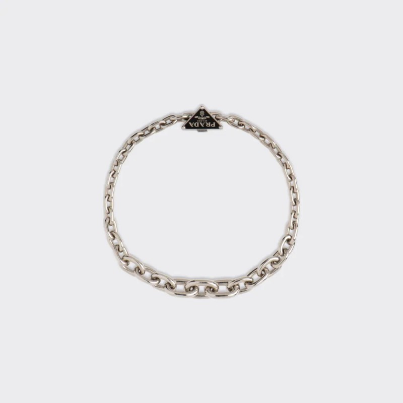 這款銀質項鍊配有粗鏈,背面飾以標誌性的三角形,品牌格調鮮明。全新925銀珠寶系列以簡約而標誌性的三角形徽標為主角,用現代方式重釋朋克元素。