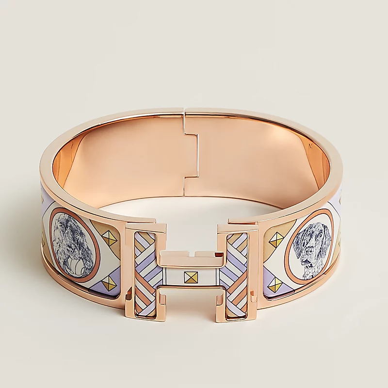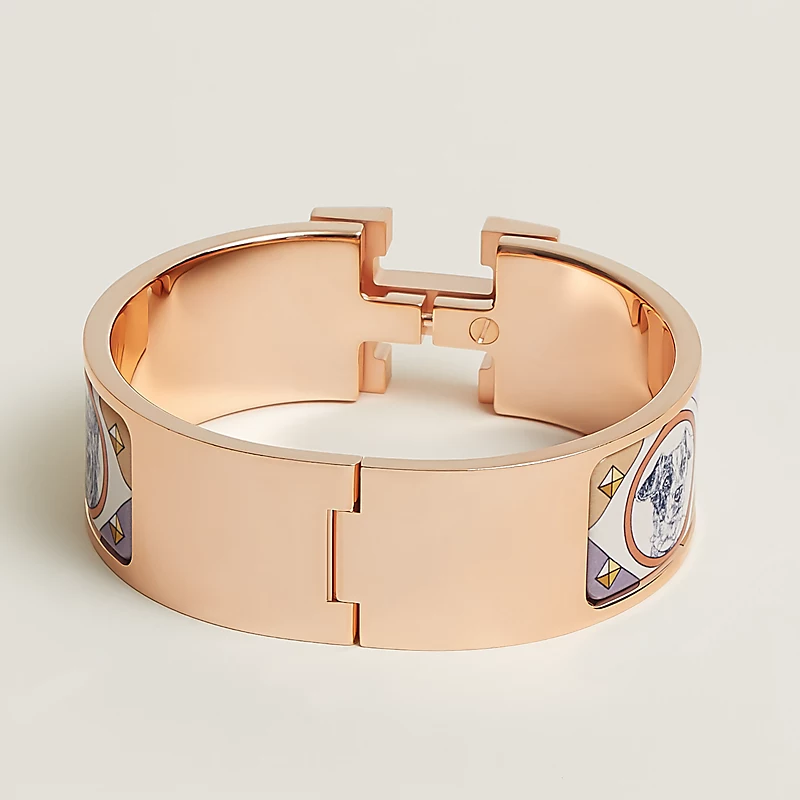 寬版"Colliers et Chiens"圖紋印花琺瑯手環,鍍玫瑰金金屬配件。法國製造。