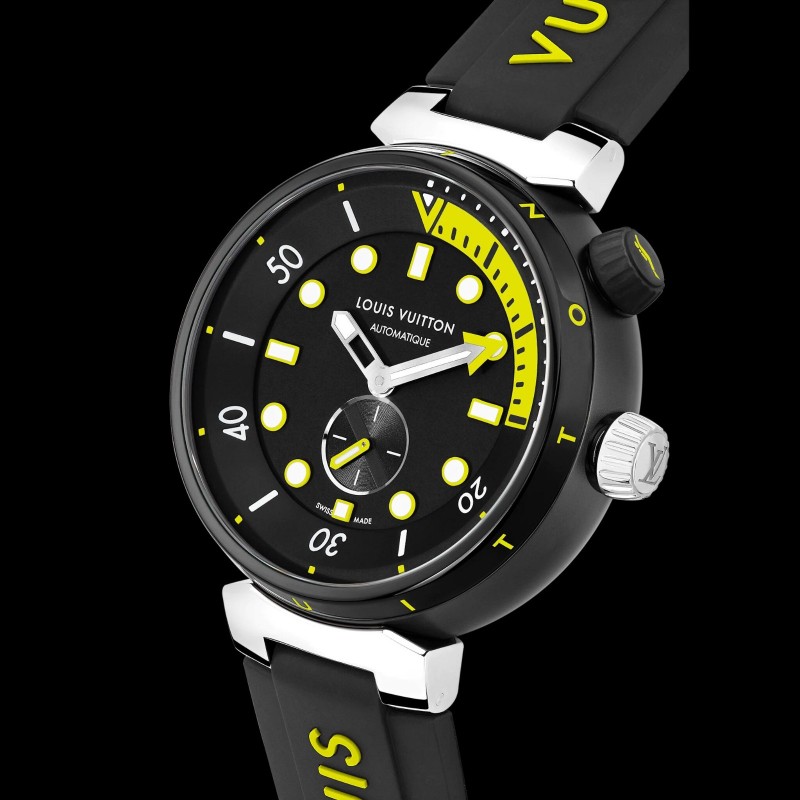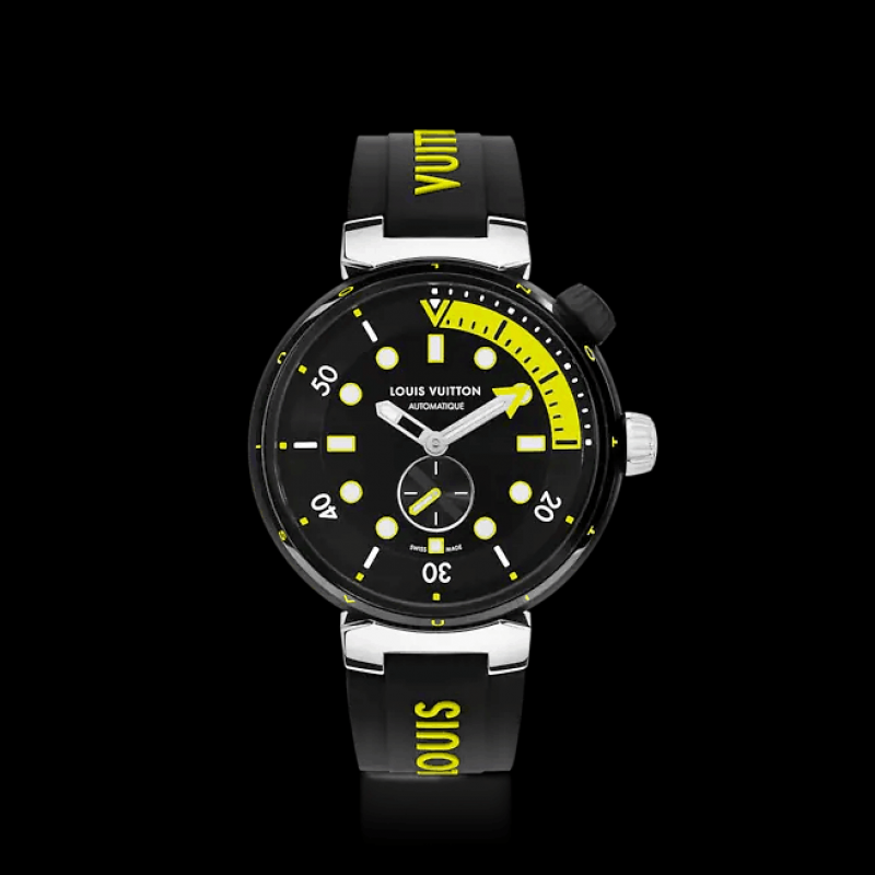這款Tambour Street Diver的風格剛毅前衛,是品牌最具運動氣息的設計,亦是功能最全面的腕錶傑作。Neon Black型號採用強烈的對比色調,錶盤和錶殼上的黑色和螢光黃色相互映襯,彰顯現代風格。腕錶具有傳統潛水功能,同時融合色彩繽紛和別出新裁的設計,盡顯路易威登的格調。
