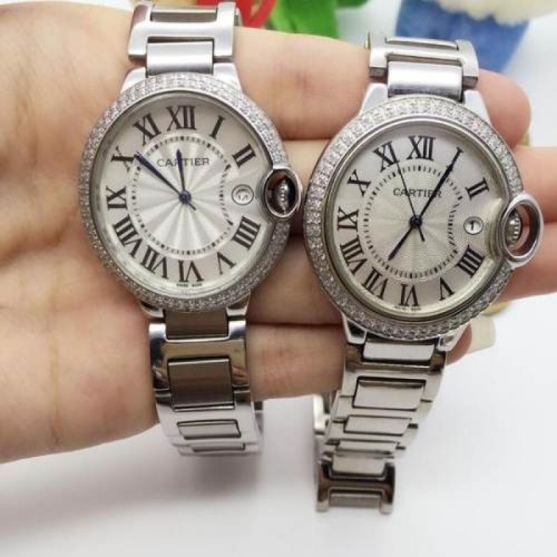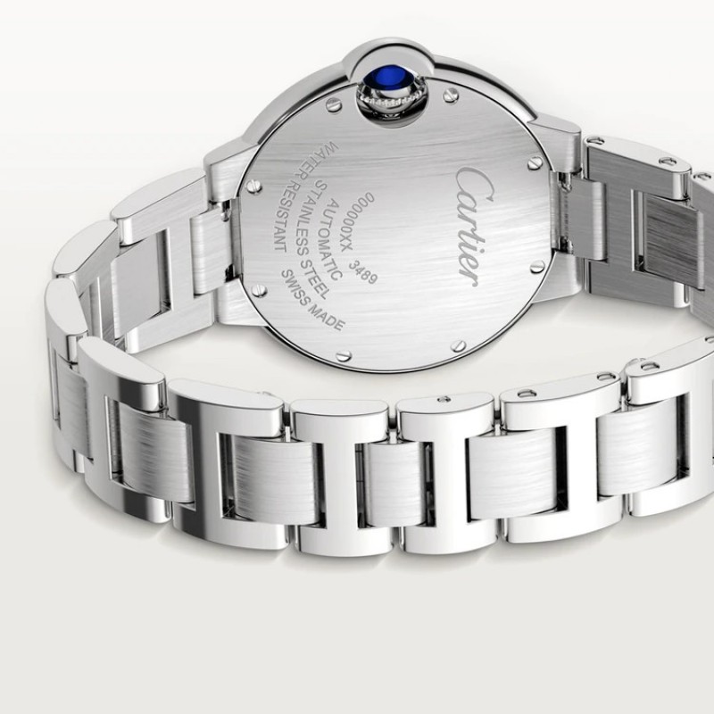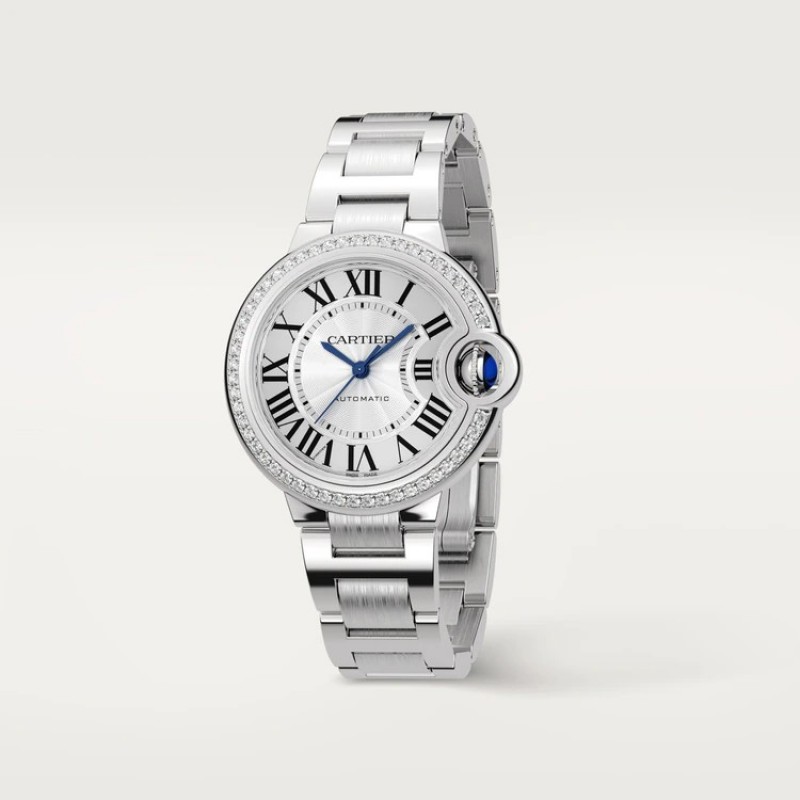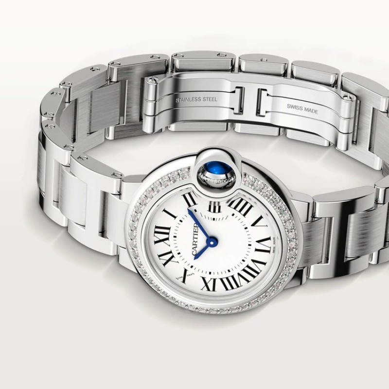 《女士》28 毫米,石英機芯,精鋼,鑽石Ballon Bleu de Cartier 腕錶,28 毫米。石英機芯。精鋼錶殼和精鋼凹槽表冠鑲嵌一顆合成凸圓形尖晶石。精鋼表圈鑲嵌 42 顆鑽石,總重 0.52 克拉。蛋白石錶盤。藍鋼劍形指針。藍寶石水晶。精鋼錶鍊,手腕尺寸:165 毫米。厚度:9 毫米。防水 3 巴(約 30 米/100 英尺)。