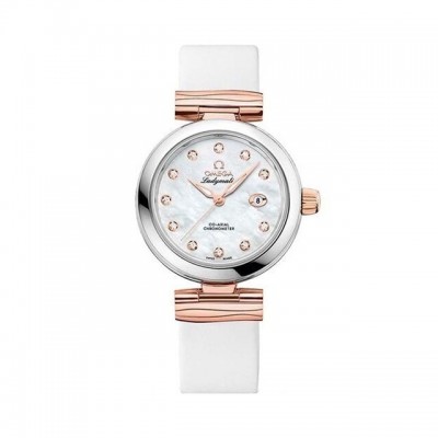 Ladymatic腕表於1955年首度問世,隨即成為引領女士時尚的代表性表款。歷經60年,其迷人風格與優雅風範仍絲毫不減。 這款腕表採用不銹鋼表殼,襯以18K Sedna™金及不銹鋼的波浪型邊緣磨砂金屬表鏈帶。光面斜角指針及11顆鑽石刻度底座亦採用了Sedna™金。 帶有珍珠光澤的白色珍珠貝殼表面上配置雪花鋪鑲鑽石表圈,光面表冠鑲嵌一顆「Brilliant Omega cut」鑽石。 3時位置設有日曆窗,配備內表殼,內置歐米茄同軸機芯8520。