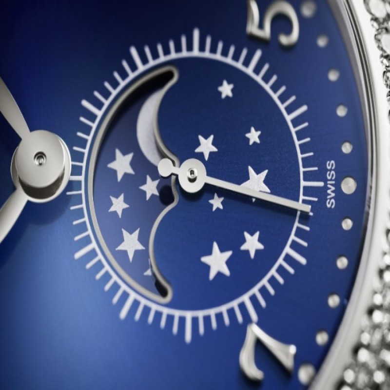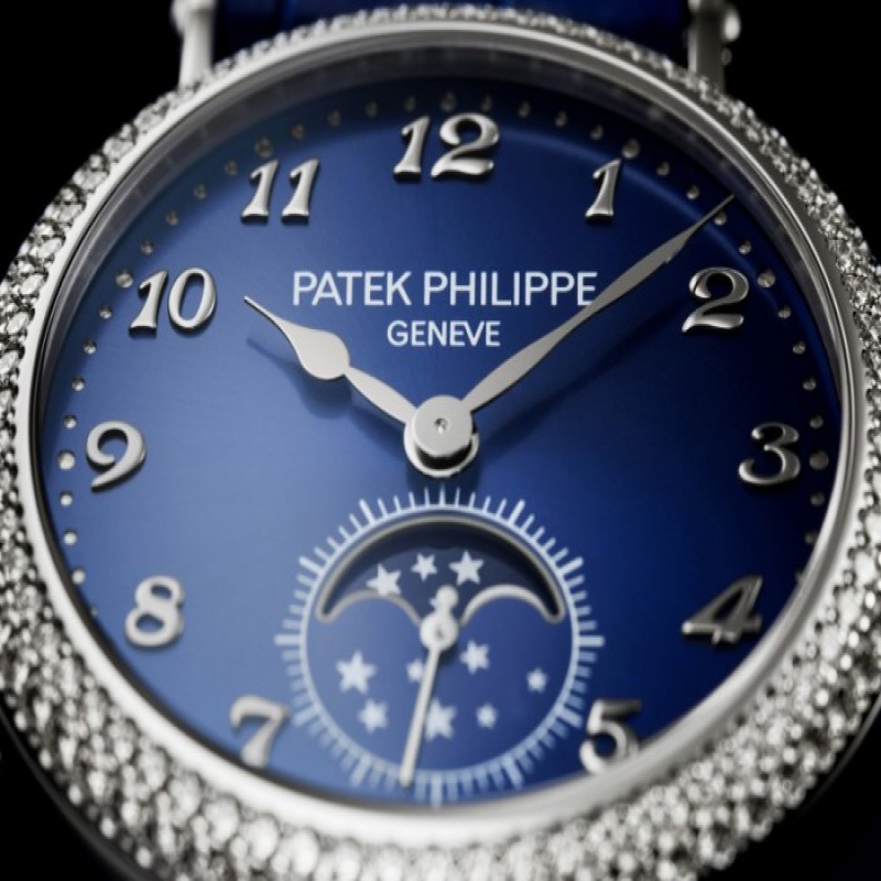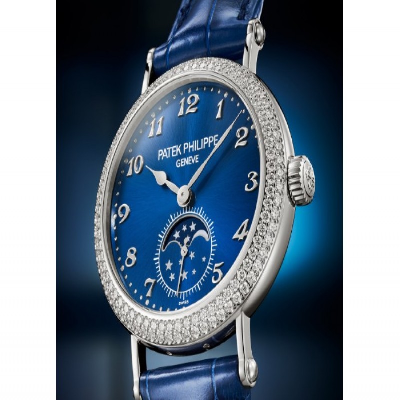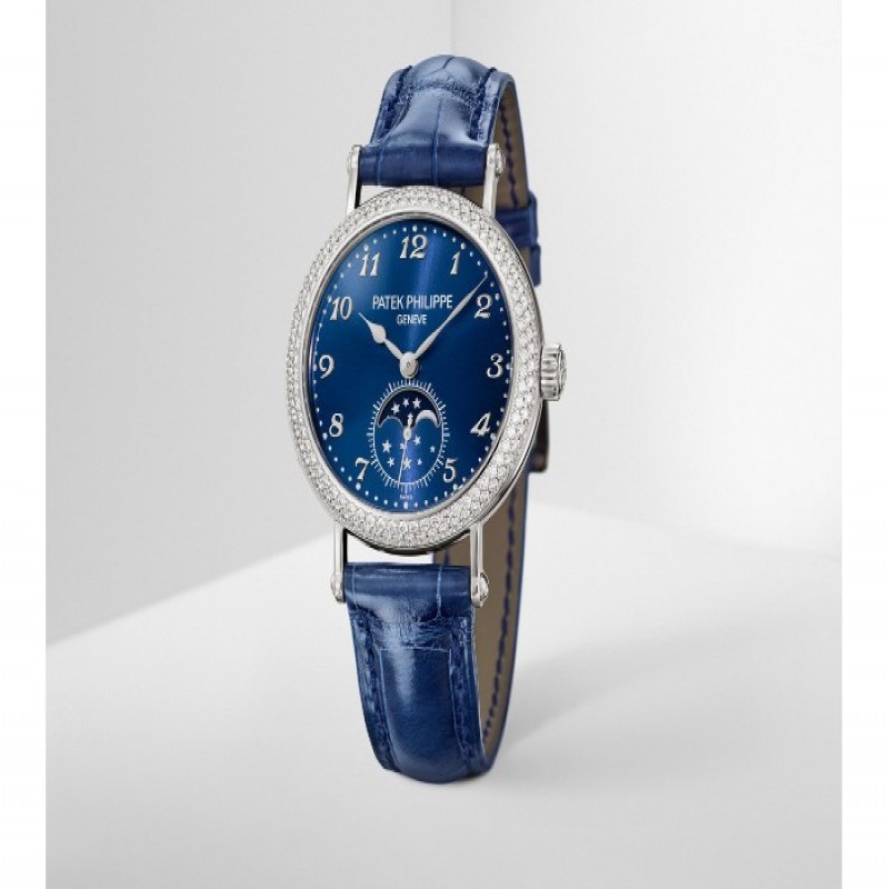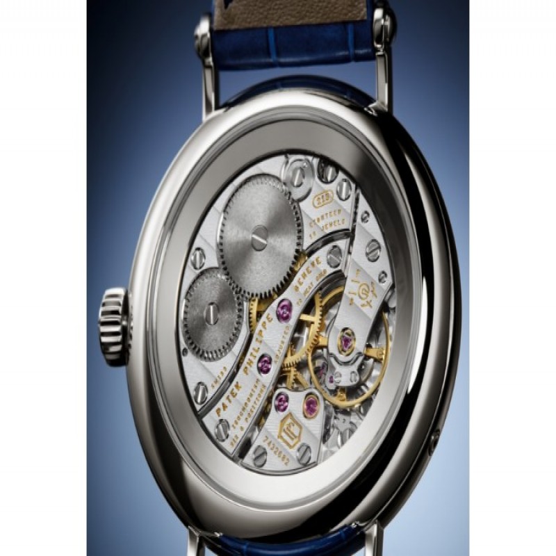 錶盤材質:藍色日輝紋,金質立體寶璣字塊,白金梨形指針