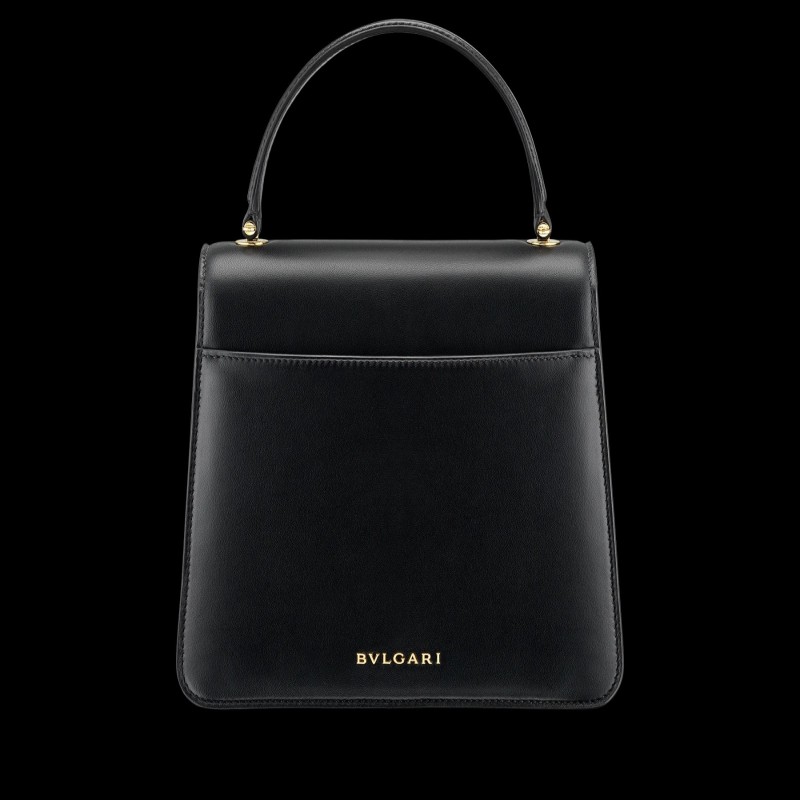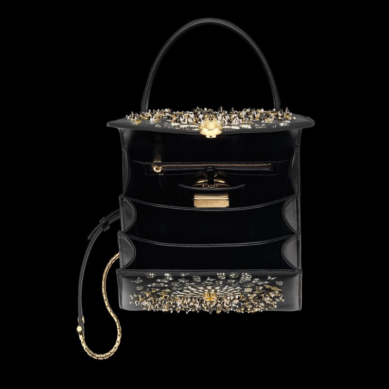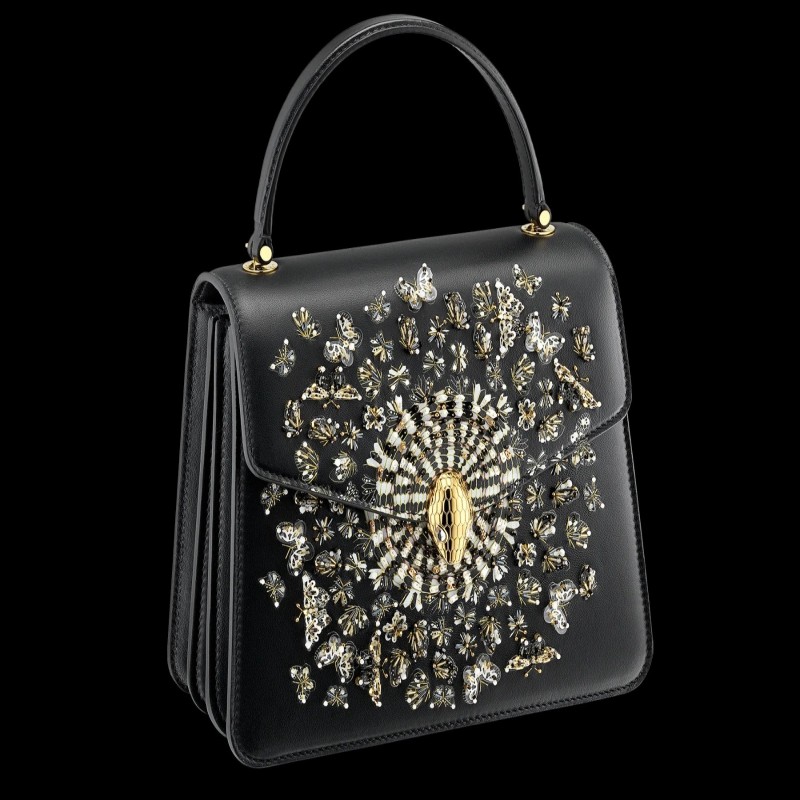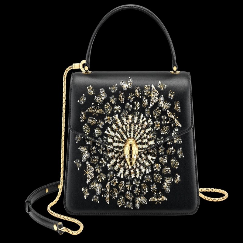 “Mary Katrantzou x Bvlgari”黑色納帕皮革手提包,黑色納帕皮革內襯。鍍金黃銅新款 Serpenti 頭部搭扣,飾有迷人水晶眼睛。特別版本。