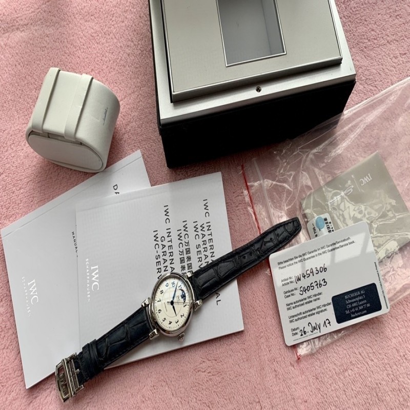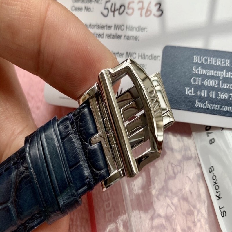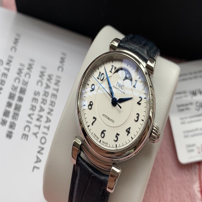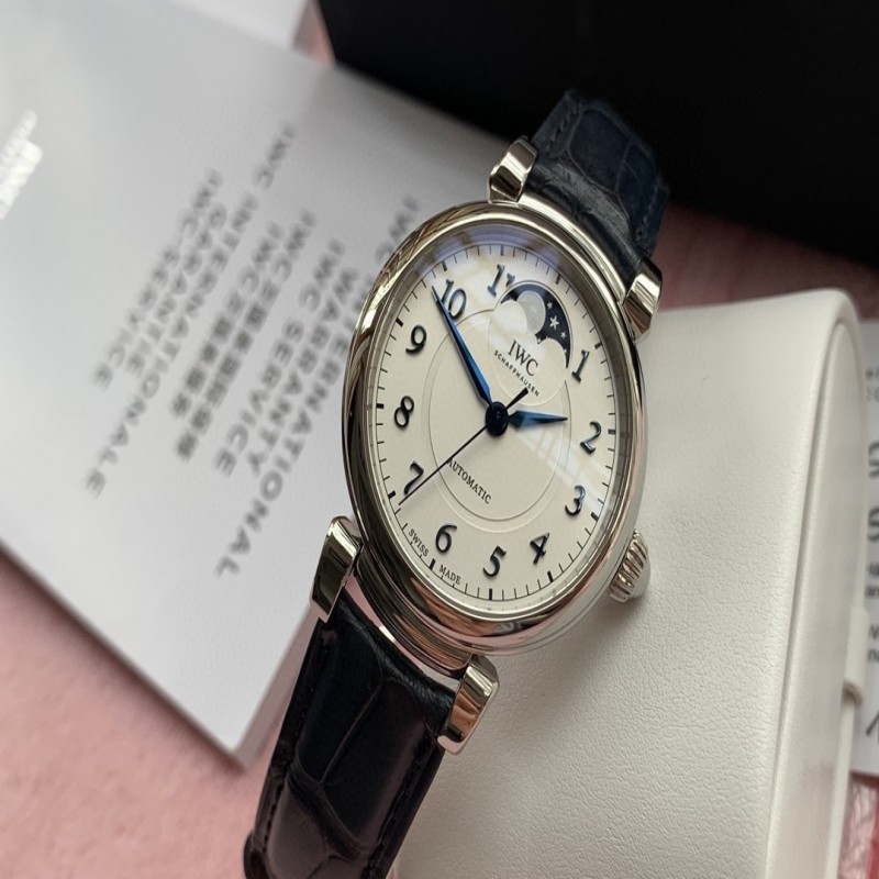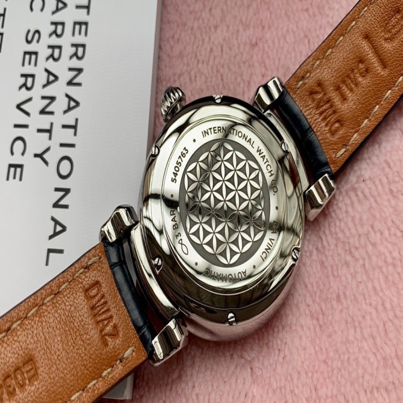 腕錶點評:這款萬國達文西系列的中性手錶直觀上的感受是三款中最為典雅的一款,採用35800型自動上弦機芯,潔白的錶盤搭配藍色的指針是經典的結合,月相盤採用藍色與銀色相間結合,阿拉伯數字時標和低調的凹槽內圈又在簡潔的基礎上不失優雅,這種階梯式錶盤內圈使得鍍銀錶盤看起來更加靈活,搭配深藍色的Santoni鱷魚皮錶帶貼合在手腕上,從視覺來看更加生動。這款手錶的特別之處在於它的全新可移動表耳,這個設計令錶帶貼服手腕,佩戴舒適,它的表徑為36毫米中號錶殼,試戴效果很好,適合手腕纖細的人群佩戴,男性佩戴直觀感受更為儒雅,女性佩戴直觀感受更為乾練、精緻,所以這是一款中性表中較為經典的錶款。